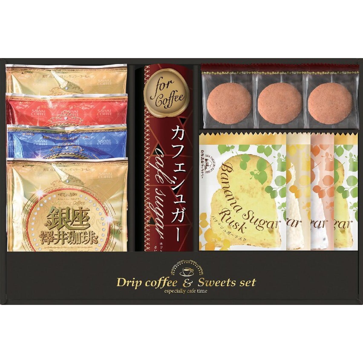 ●数量・内容:銀座澤井珈琲ドリップコーヒー(ゴールドブレンド)×2、(ルビーブレンド・ブレンドアクア)×各1、カフェシュガー3g×5、クリームモンブランクッキー×3、バナナラスク×2、シュガーラスク・セサミラスク×各1
