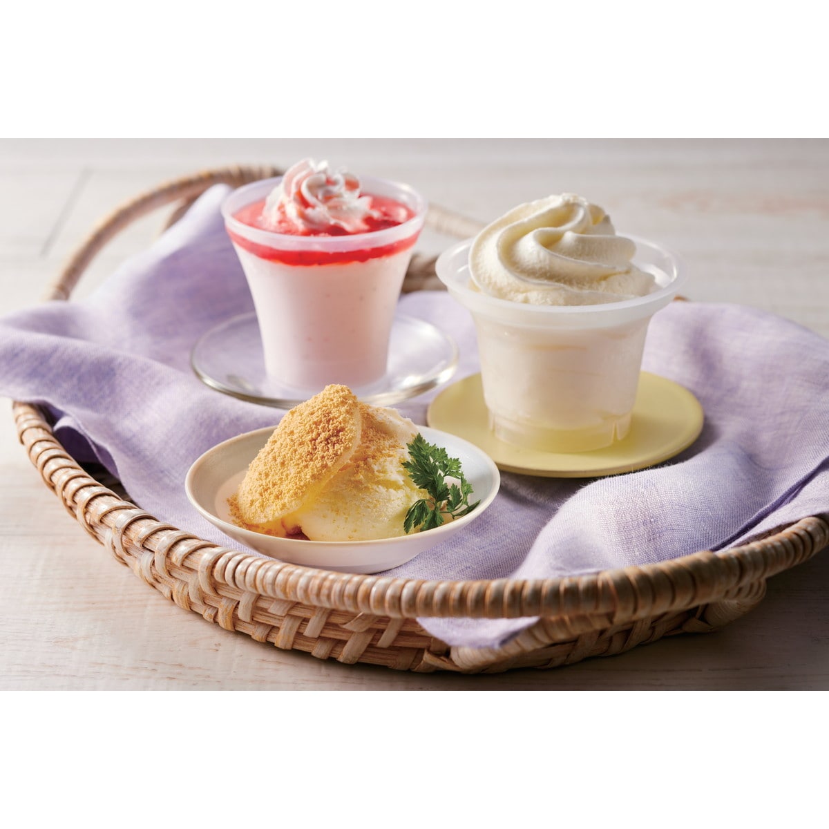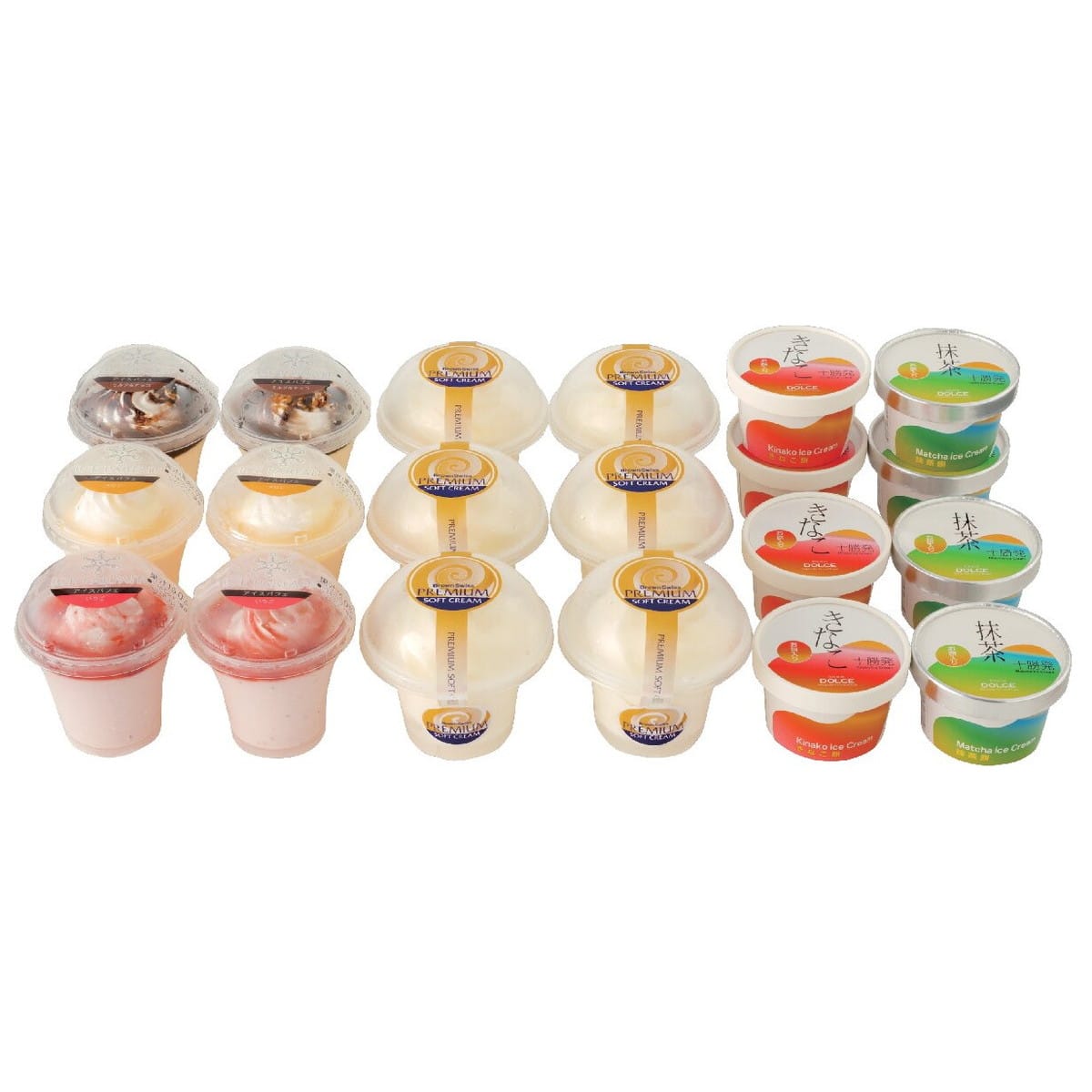●数量・内容:ミニパフェ(ミルク&チョコ・メロンシャーベット・ストロベリー各120ml×2)、プレミアムソフトクリーム120ml×6、もちもちアイス(きなこ・抹茶各80g×4)