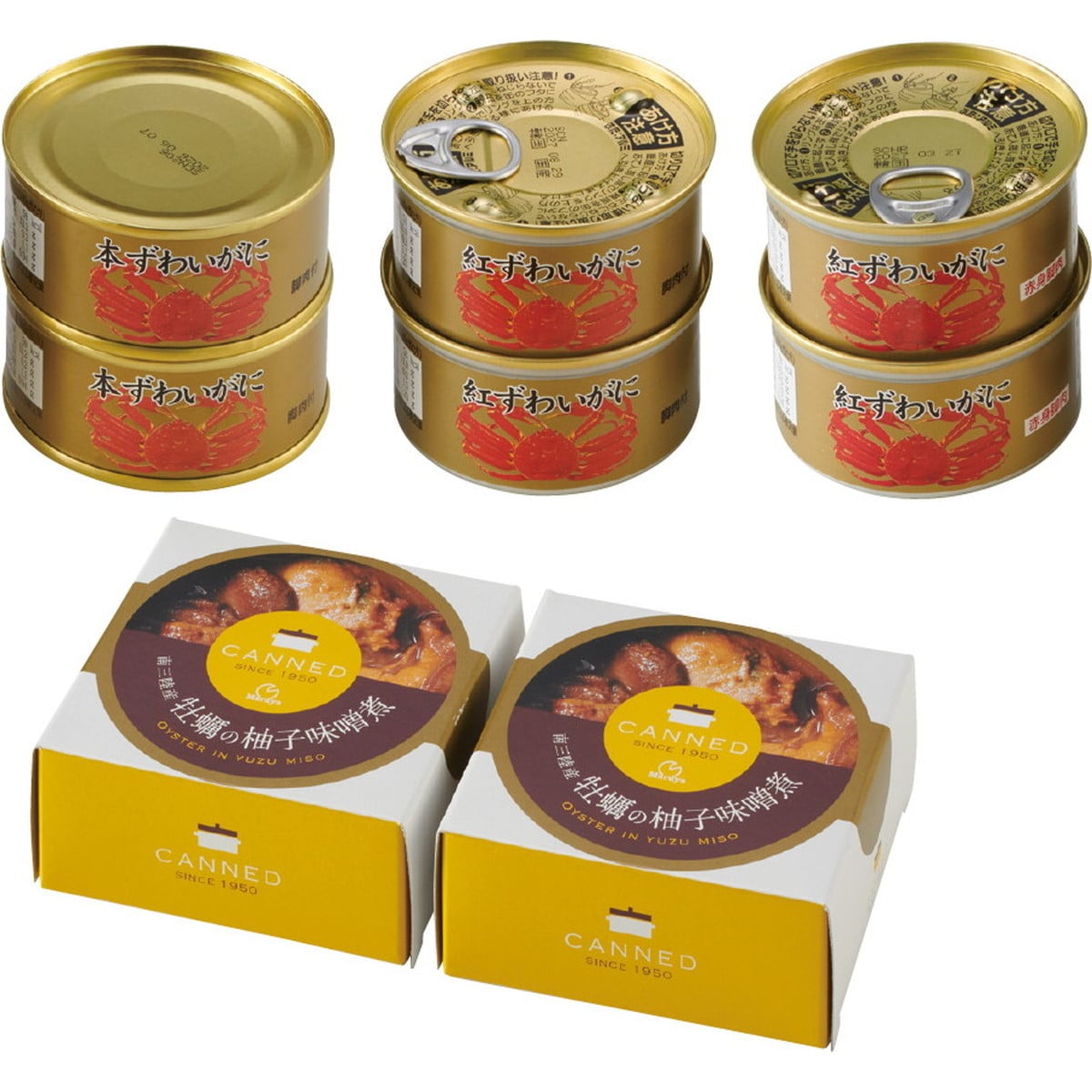 ●原材料:【本ずわいがに脚肉付】ずわいがに、砂糖、食塩/調味料(アミノ酸等)、増粘多糖類、リン酸塩(Na)、酸化防止剤(亜硫酸塩)【紅ずわいがに赤身脚肉】べにずわいがに、砂糖、食塩/調味料(アミノ酸等)、増粘多糖類、リン酸塩(Na)、酸化防止剤(亜硫酸塩)【紅ずわいがに脚肉付】べにずわいがに、砂糖、食塩/調味料(アミノ酸等)、増粘多糖類、リン酸塩(Na)、酸化防止剤(亜硫酸塩)【南三陸産牡蠣の柚子味噌煮】牡蠣(宮城県)、ゆず味噌(味噌(宮城県製造)、果糖ぶどう糖液糖、砂糖、ワイン調製品、醸造酢、ゆず果汁、その他)(一部に大豆を含む)