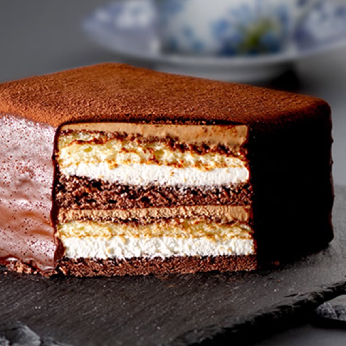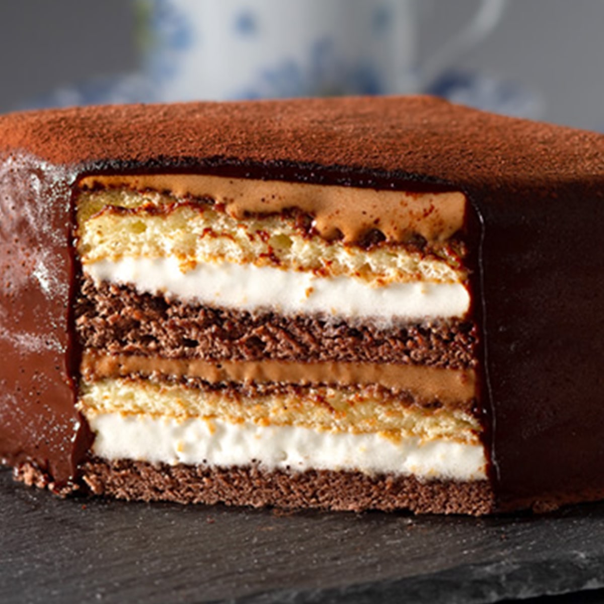 【テレビ番組で大人気商品】 バニラスポンジ、ミルクチョコレート、チョコレートスポンジ、生クリームの4層を倍に重ね、生チョコレートでコーディング、ココアであしらった贅沢な逸品です。 見た目は石畳のように硬そうですが、ナイフを入れるととても柔らかく、見た目とのギャップも楽しめる絶品チョコレートケーキです。