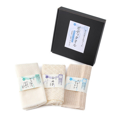 新潟県十日町市のきもの屋さんが作ったボディータオルです。からむしとシルクとオーガニックコットンの3種類をセットにしました。特徴としては、からむしは、からむしの適度な刺激が、お肌の汚れをさっぱり爽やかに洗い流してくれます。シルクは皮膚と似たたんぱく質で出来ているため、なめらかな肌触りでデリケートなお肌のかたにも安心してご使用いただけます。オーガニックは、農薬や化学肥料を一切使わず生産されたオーガニックコットンを使用しているため敏感肌の方におすすめです。