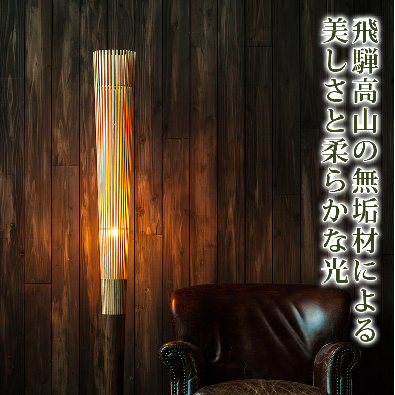 日本(nippon)のあかりを飛騨高山からお届けします。ラインのみでデザインされたLEDフロアースタンドです。LED直接の光と木に反射した光が混在することにより生まれる、柔らかく心地よい明かりが特徴的です。木の温かみも感じてもらうために、あえてフォルムはスリムで直線的にし、質感を際立たせています。和・洋問わず置き場所を選ばないnipponデザインのスタンドです。
