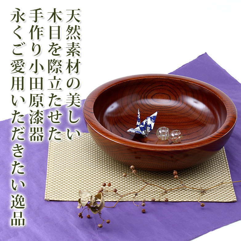 伝統工芸品、小田原漆器のこね鉢です。そば打ち用としても大変人気があります。小田原漆器は、ケヤキ材などが持つ自然の美しさを充分生かした摺り漆塗りや、木地呂塗りが主体の手作り漆器です。ケヤキを主に使用しているので、堅牢でゆがみの少ないのも特徴のひとつ。永くお使いいただける逸品です。
