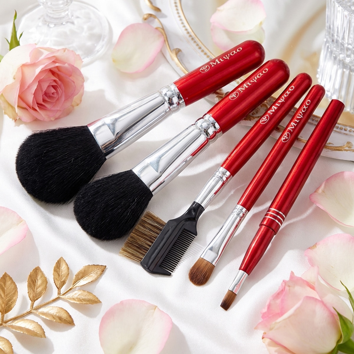 パウダーブラシ・チークブラシはいずれも最高級山羊毛。アイシャドウブラシ・携帯用リップブラシ・ブラシ&コームはMiyaoの化粧筆の中でも外せない品。プレゼントに最適なセットです。