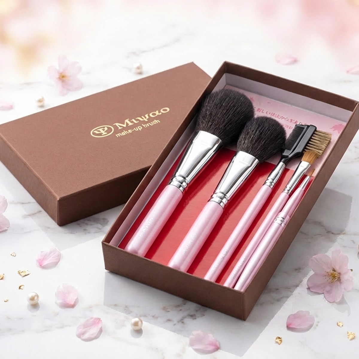 この地で創業55年を迎える、癒しの熊野化粧筆 宮尾の「熊野化粧筆メイクブラシ ピンクパール5点セット」は、高級山羊毛の「パウダーブラシ」、「チークブラシS」、セーブルの「アイシャドウブラシ」、アイメイクの必需品の「ブラシ&コーム」、ピンクの輝きが大人かわいい「携帯リップブラシ」のセット。