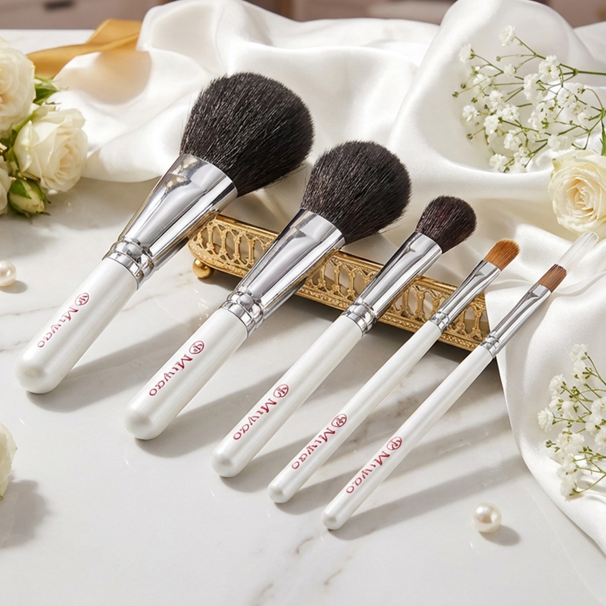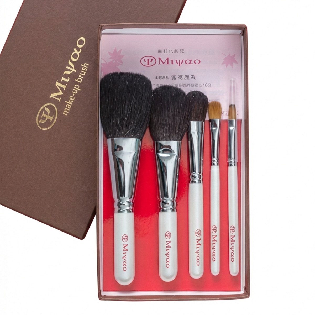この地で創業55年を迎える、癒しの熊野化粧筆 宮尾の「熊野化粧筆メイクブラシ・ホワイトパール5点セット」は、高級山羊毛の「パウダーブラシ」、「チークブラシ」、セーブルの「アイシャドウブラシS 」、「リップブラシ平」、ポニーの「アイカラーブラシL」のセット。
