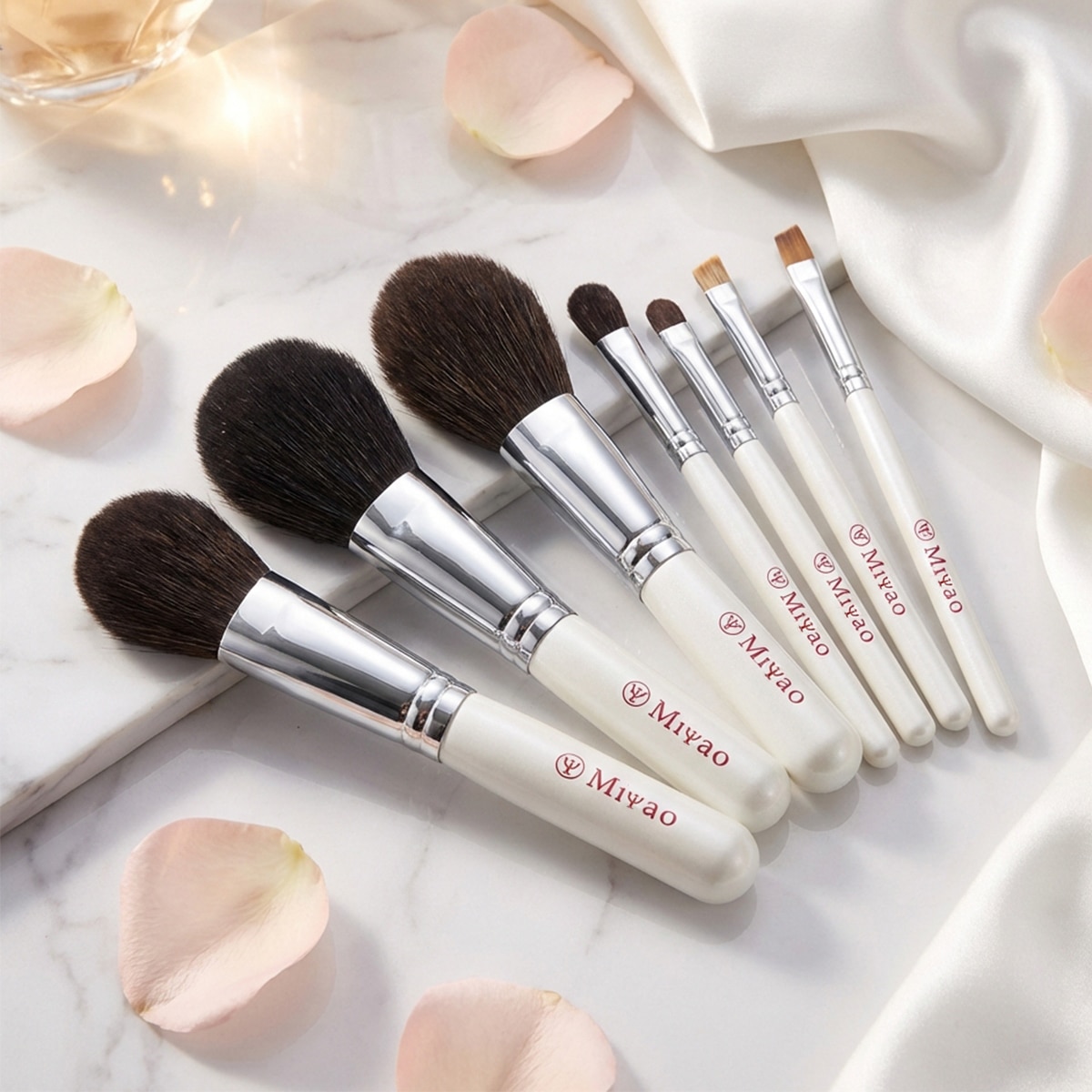 この地で創業55年を迎える、癒しの熊野化粧筆 宮尾の「熊野メイクブラシ7本セット&携帯用ポーチ[ショート軸タイプ・ホワイトパール]」は、灰リス100%の肌に吸い着くような滑らかさの「パウダーブラシ」をはじめ、高級山羊毛の「チークブラシ」、ポニーの「アイカラーブラシL」、セーブルの「アイシャドウブラシS」などの贅沢な7本セット。