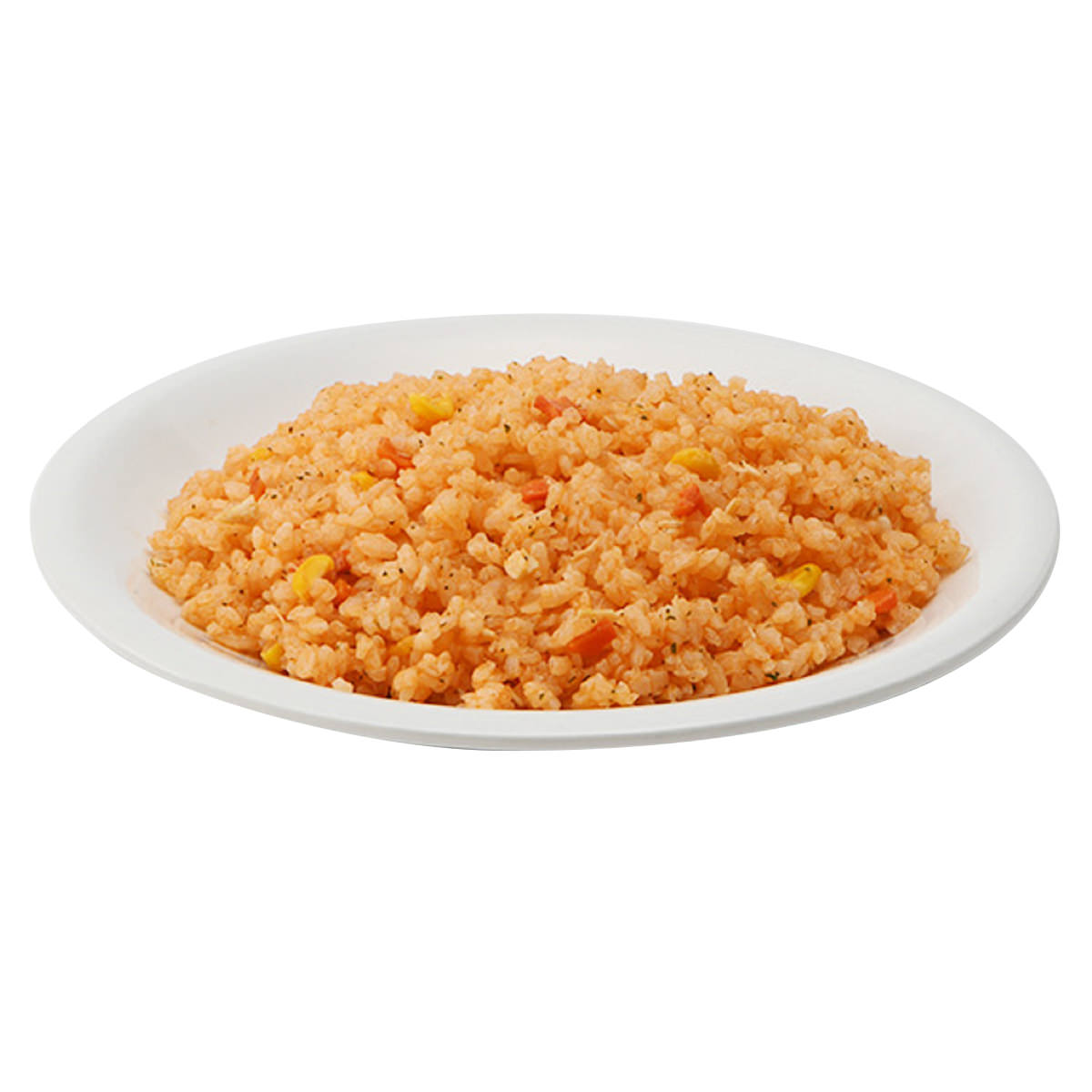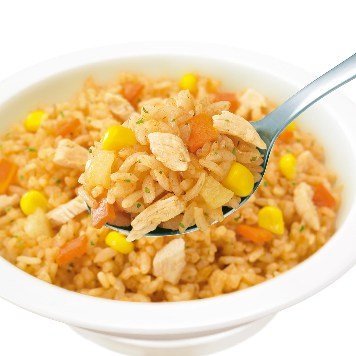 ●原材料:【チキンライス】うるち米(国産)、味付乾燥具材(味付鶏肉、乾燥人参、コーン、味付玉ねぎ)、調味粉末(食塩、ポークパウダー、粉末醤油、トマトパウダー、チキンエキスパウダー、砂糖、野菜エキスパウダー、香辛料、パセリ、酵母エキスパウダー、食用植物油脂)/調味料(アミノ酸等)、トレハロース、甘味料(カンゾウ)、微粒酸化ケイ素、香料、パプリカ色素、酸化防止剤(ビタミンE)、酸味料、(一部に小麦・大豆・鶏肉・豚肉を含む)
