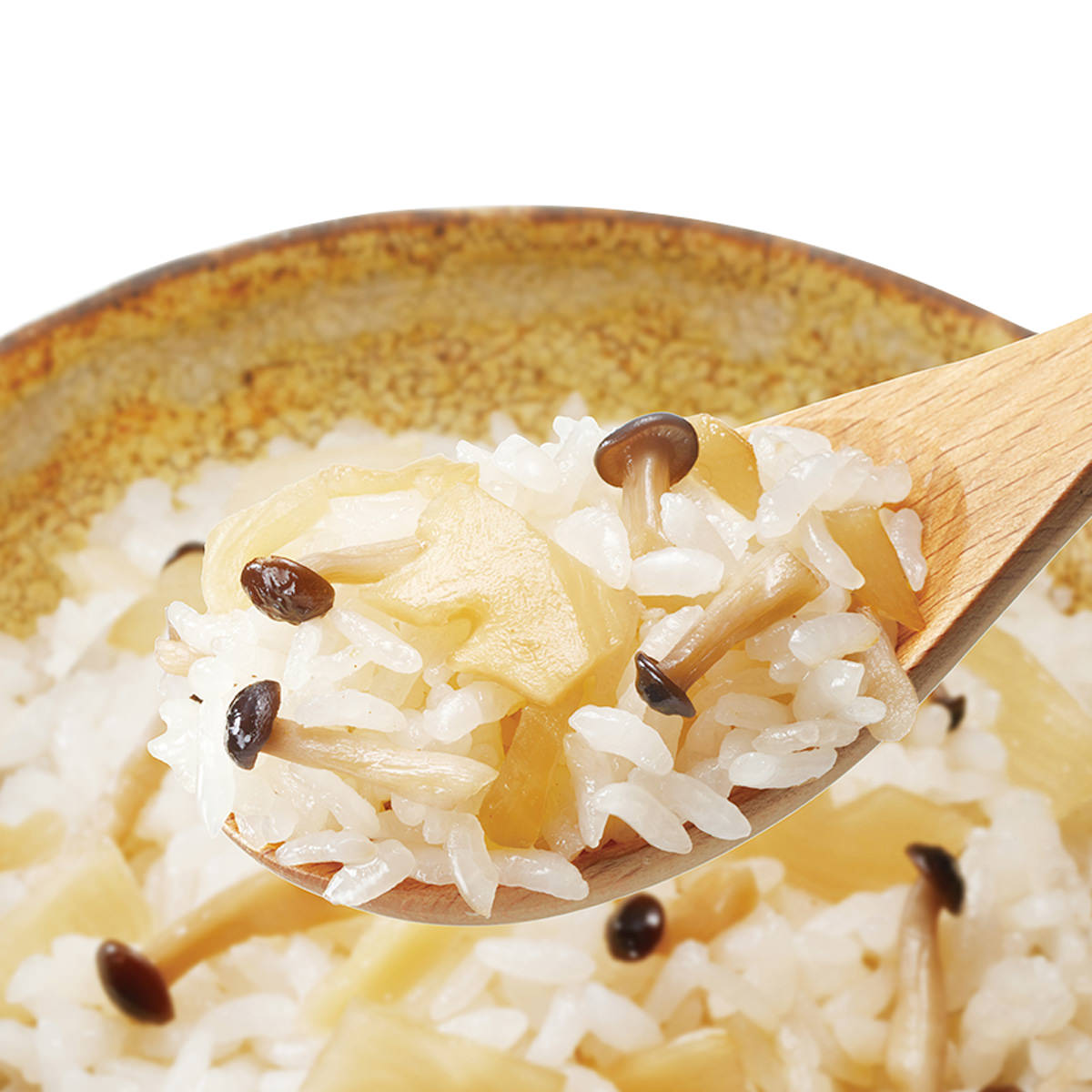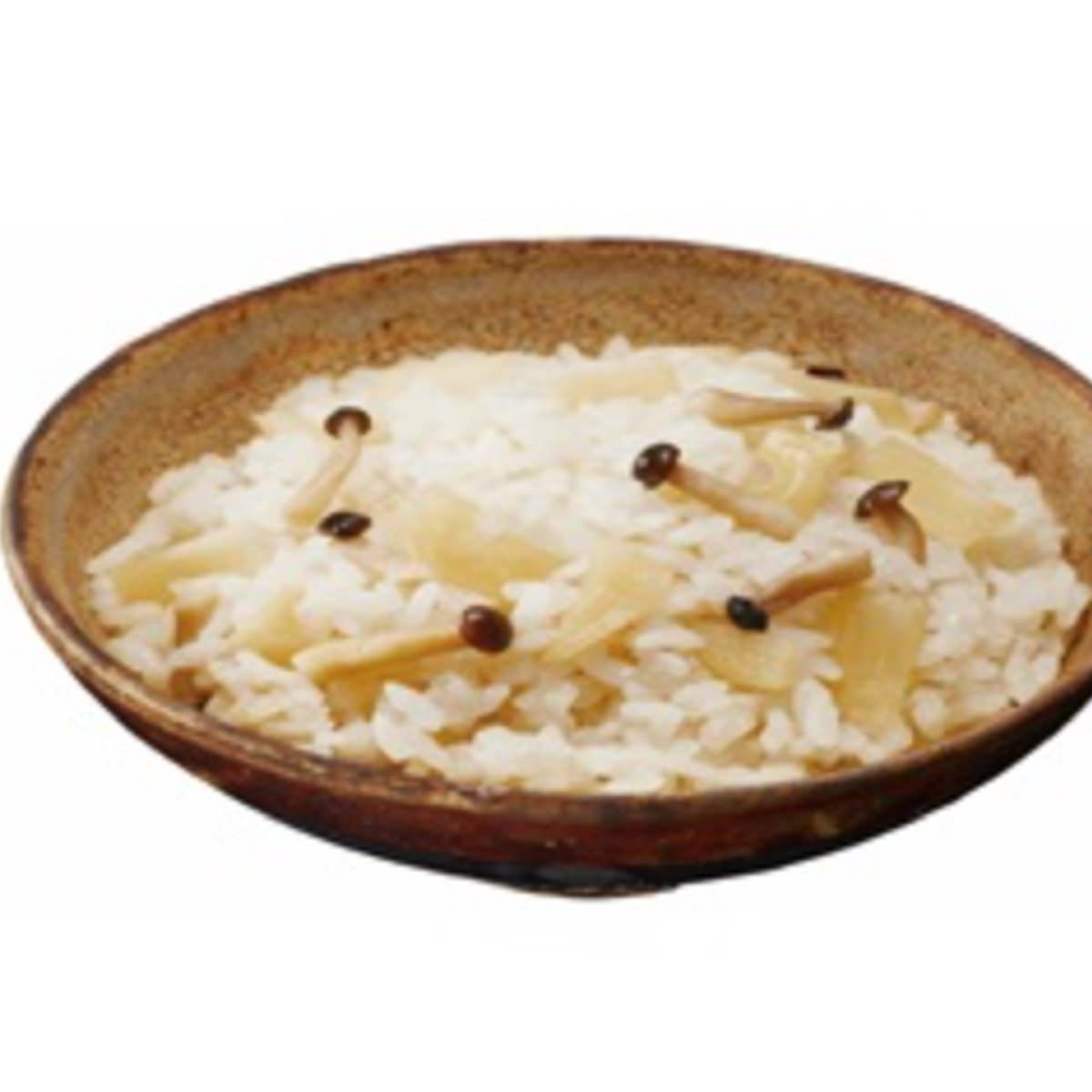 ●原材料:【たけのこごはん】うるち米(国産)、味付乾燥具材(水煮たけのこ、ぶなしめじ、ぶとう糖、でん粉分解物、食塩)、調味粉末(食塩、かつお節エキス粉末、かつお節粉末、ぶどう糖加工品、砂糖、でん粉)/調味料(アミノ酸等)、トレハロース、酸化防止剤(ビタミンE)、香料