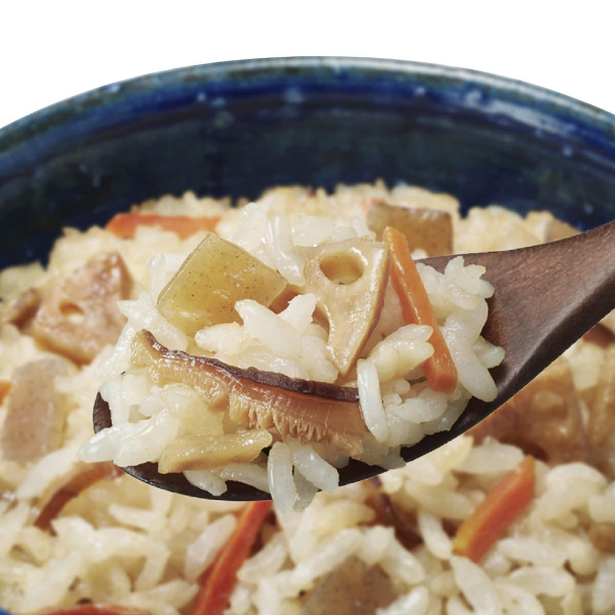 ●原材料:【アレルギー対応五目ごはん】うるち米(国産)、味付乾燥具材(こんにゃく、醤油風調味料、水煮れんこん、食用植物油脂、砂糖、乾燥人参、乾燥ごぼう、乾燥椎茸、食塩)/ソルビトール、調味料(アミノ酸)、カラメル色素、酸味料、酸化防止剤(ビタミンE)、香料