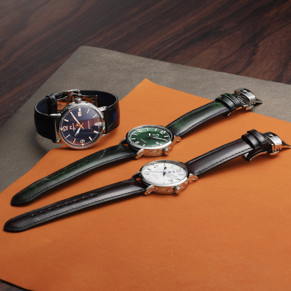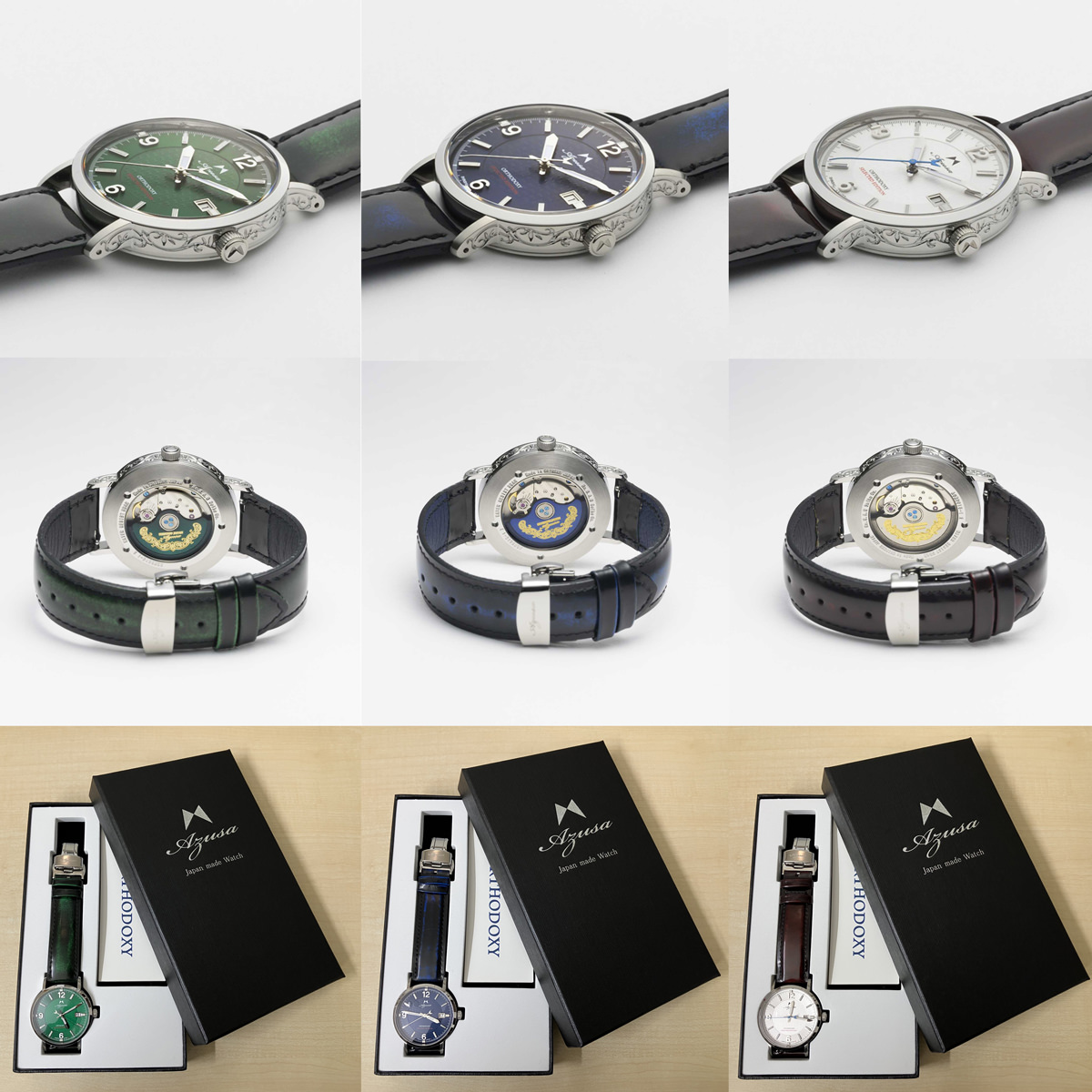 ステンレス製のケースに刻まれた彫刻が特徴の「腕時計 Azusa ORTHODOXY KIZAMU」です。過去にクラウドファンディングでもご好評いただいた「Azusa ORTHODOXY 2nd」をベースに、ケースの繊細な彫刻や文字盤カラーに合わせた色付きの回転錘など、より一層デザイン性にもこだわって作り上げました。牛革ベルトにはDバックルが標準装備となっており、着脱時もベルトが輪になった状態のままになるのでスムーズに着脱できる上、時計の落下を防止できます。文字盤カラーはグリーン、ブルー、ホワイトの3色から選べます。
