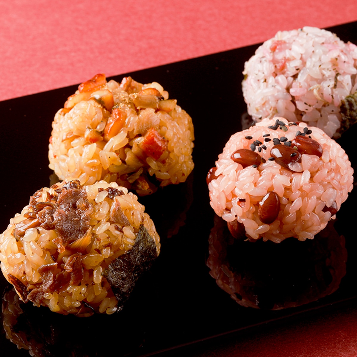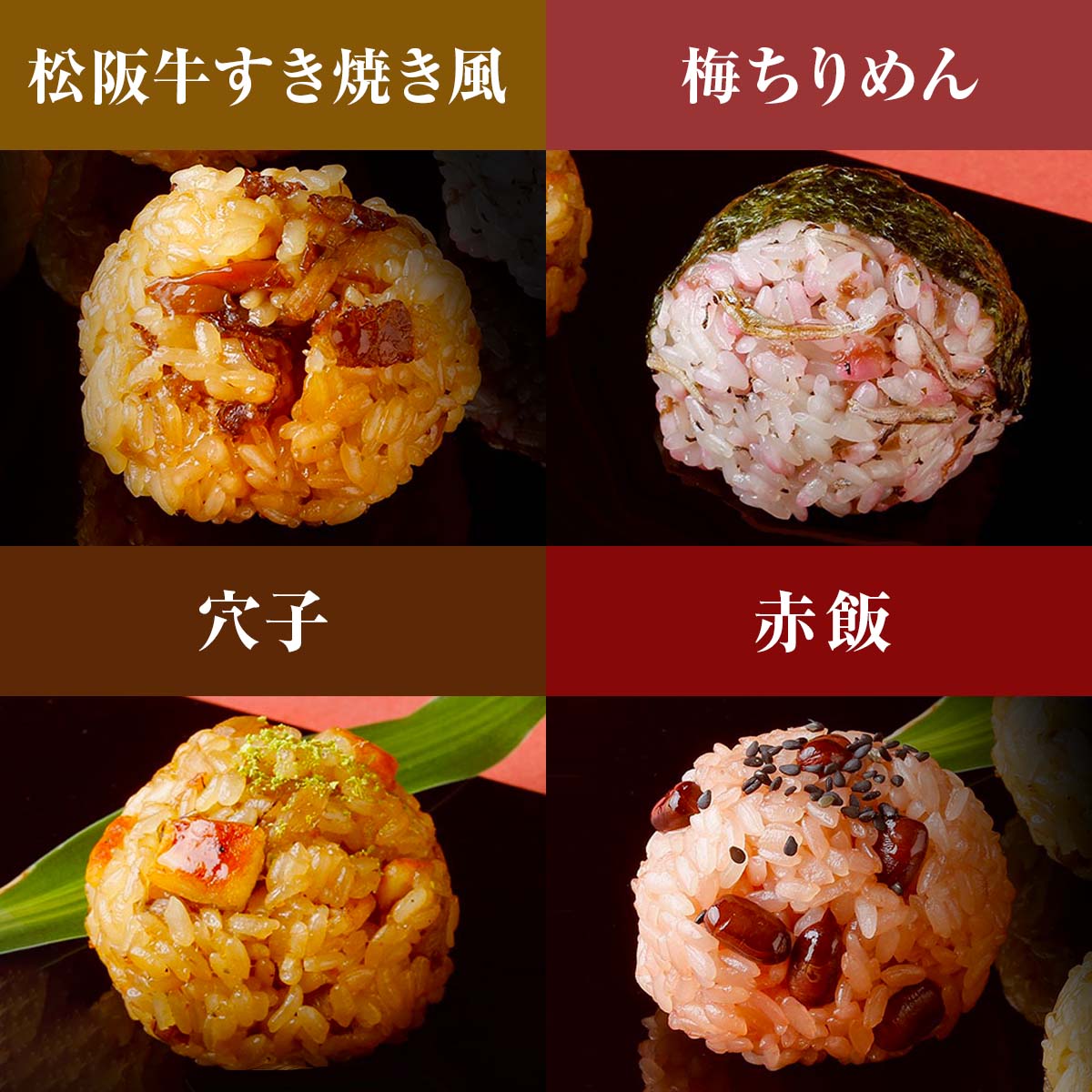 ●原材料:<松阪牛>餅米(国産)、牛肉、ごぼう、エリンギ、玉葱、、醤油、砂糖、酒、みりん、だし(鰹節、鰯、昆布、その他)/トレハロ-ス、(一部に小麦・大豆・牛肉を含む) <梅とちりめん>餅米(国産)、梅、かたくちいわし、海苔、しそ、漬け原材料(食塩、還元水飴、しそ液、砂糖、醸造酢、その他)、だし(鰹節、鰯、昆布、その他)/トレハロ-ス、調味料(アミノ酸等)、酒精、野菜色素、酸味料、ビタミンB1(一部に小麦・大豆を含む) <穴子>餅米(国産)、穴子蒲焼、ゴボウ、蒲焼のたれ、醤油、砂糖、みりん、酒、だし(鰹節、鰯、昆布、その他)、山椒/トレハロ-ス、調味料(アミノ酸等)、ゼラチン、増粘材(増粘多糖類、加工澱粉)、着色料(カラメル、紅麹)、pH調整剤(一部に小麦・大豆・ゼラチンを含む) <赤飯>餅米(国産)、小豆(国産)、ごま、塩/トレハロ-ス、重曹、(一部にごまを含む)
