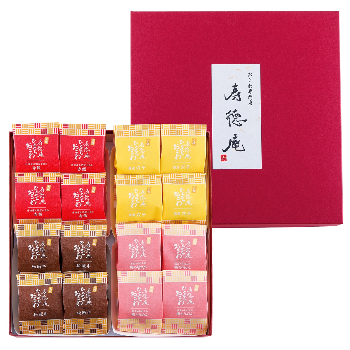 「寿徳庵」のこだわりが詰まったミニサイズの『ひとくちおこわ』は、おこわを気軽に食べていただけるようにつくられた直径約5センチの丸いおこわおにぎりです。もともと羽田空港で飛行機に乗る人のために考えられた商品で手を汚さずいつでも手軽に食べられる一口サイズにしています。東京・目黒で昭和54(1979)年創業の「寿徳庵」は、懐かしくも新しいおこわを追求する京風おこわ専門店です。寿徳庵のおこわは、選び抜いた国産のもち米を季節ごとに2種類ブレンドし、国産のこだわり厳選食材と絶妙な加減で合わせじっくりと蒸籠で蒸しあげました。もち米本来の甘みとモチモチ感を際立たせたこだわりが詰まった自慢のおこわです。『ひとくちおこわ4種16個入り(松阪牛・梅とちりめん・穴子・赤飯)』は、日本三大和牛の1つ松阪牛を贅沢に混ぜ込み、松阪牛の旨味たっぷりな肉汁がお米の一粒一粒にまでじっくり染み込んだ人気の高い「松阪牛」、広島・音戸産のちりめんと、刻んだカリカリ梅をちりばめた食感も楽しいさっぱり風味の「梅ちりめん」、刻んだ国産穴子を蒲焼きのタレと一緒におこわに混ぜ込み、振り掛けた山椒の刺激を楽しめる「穴子」、大粒の丹波産大納言小豆にこだわり、小豆の色のみで着色し、ふっくら風味よく仕上げた「赤飯」の4種類の異なる美味しさを楽しんでいただけます。ちょっと小腹が空いたときのおやつとしてや、忙しい時間の合間に手軽に食べることができ、甘いものが苦手な方へのお土産としても喜ばれています。