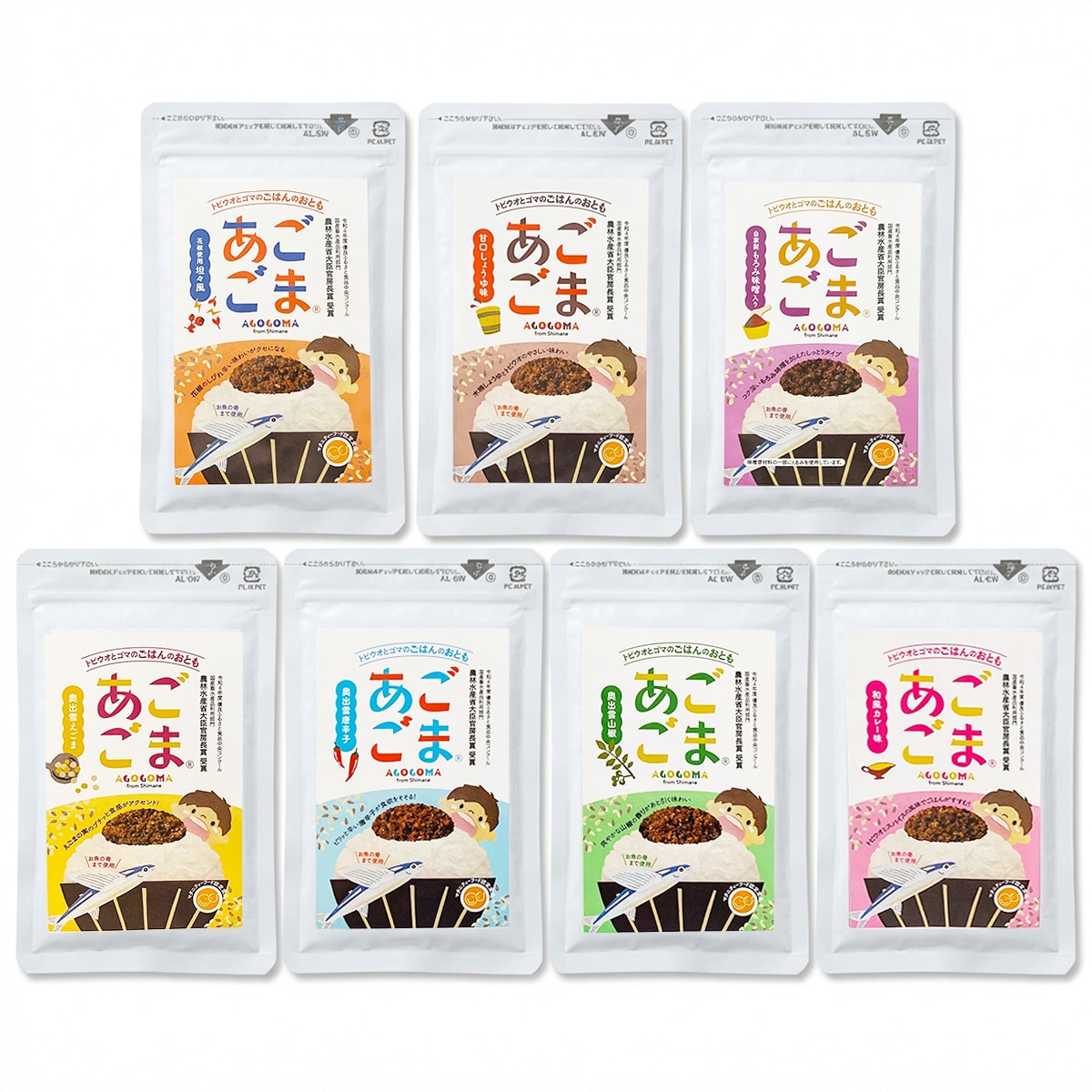 「あごごま 7種セット」は島根県産のあご(トビウオ)とゴマが主原料のソフトふりかけのバラエティ豊かなセットです。7種の味わい(甘口醤油味・花椒使用坦々風・もろみ味噌・奥出雲山椒・奥出雲唐辛子・エゴマの実入り・和風カレー味)をお届けします。ご飯のお供に、サラダや麺類のトッピングなどにもおすすめです。トビウオの骨まで粉砕して使用し、大さじ1杯につきカルシウム72mgを含有(東京都食品分析センター調べ)。マタニティフード認定商品です。お子さまからご年配の方までお楽しみいただけます。令和4年度 優良ふるさと食品中央コンクール「農林水産省大臣官房長賞」を受賞しました。