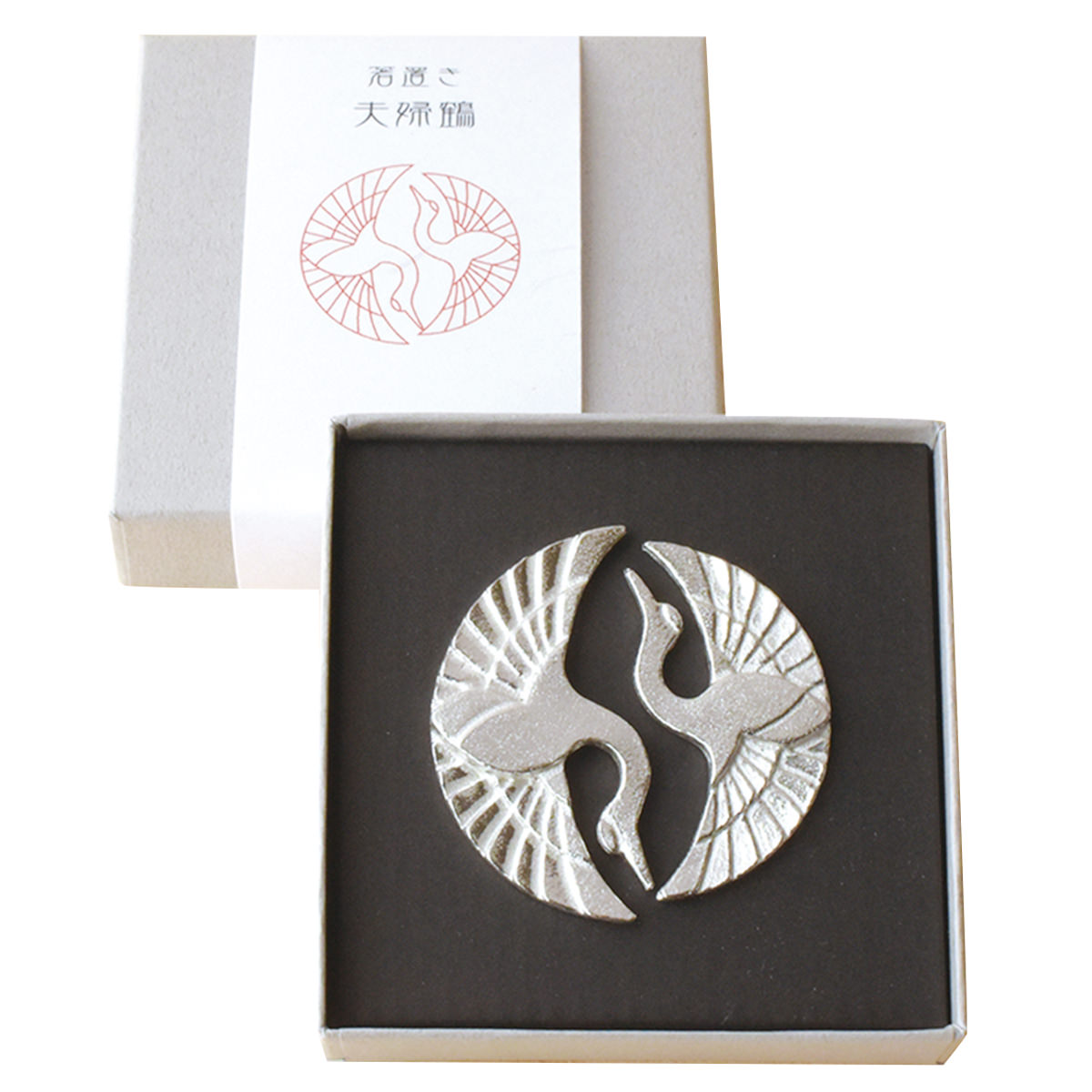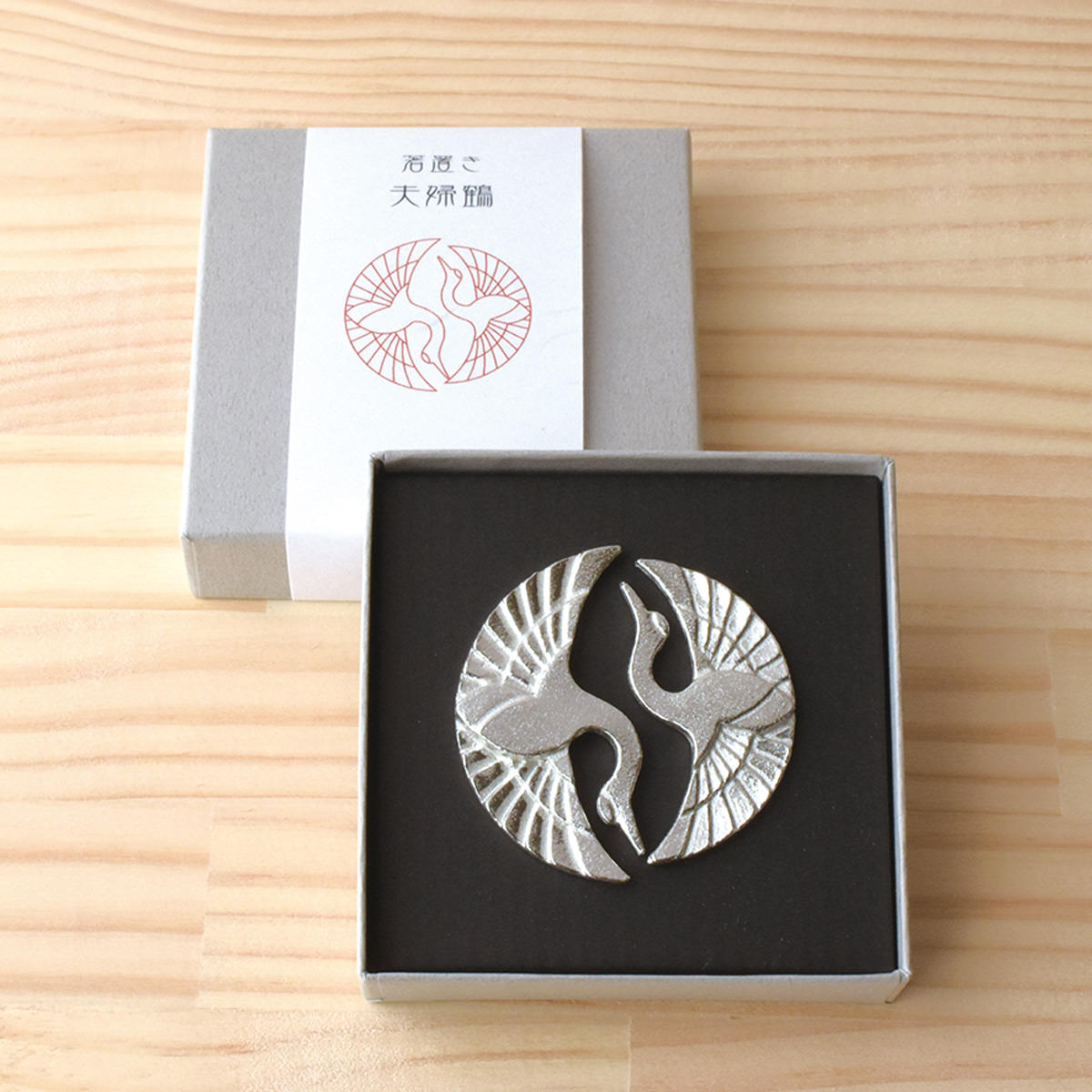 竹中銅器の「錫箸置き 夫婦鶴」です。日本の伝統的な文様で、縁起の良い鶴をモチーフにした箸置きです。鶴は長寿・健康の象徴でもあり、つがいになると一生添い遂げることから、夫婦円満の象徴ともされます。慶事の会席をはじめ、ご家庭でのお祝いの食卓を演出します。素材の錫は柔らかい金属なので、手で曲げて形を変えることができます。鶴の翼や首を軽く上向きに曲げていただくと、形が華やかになり、お箸も転がりにくくなります。