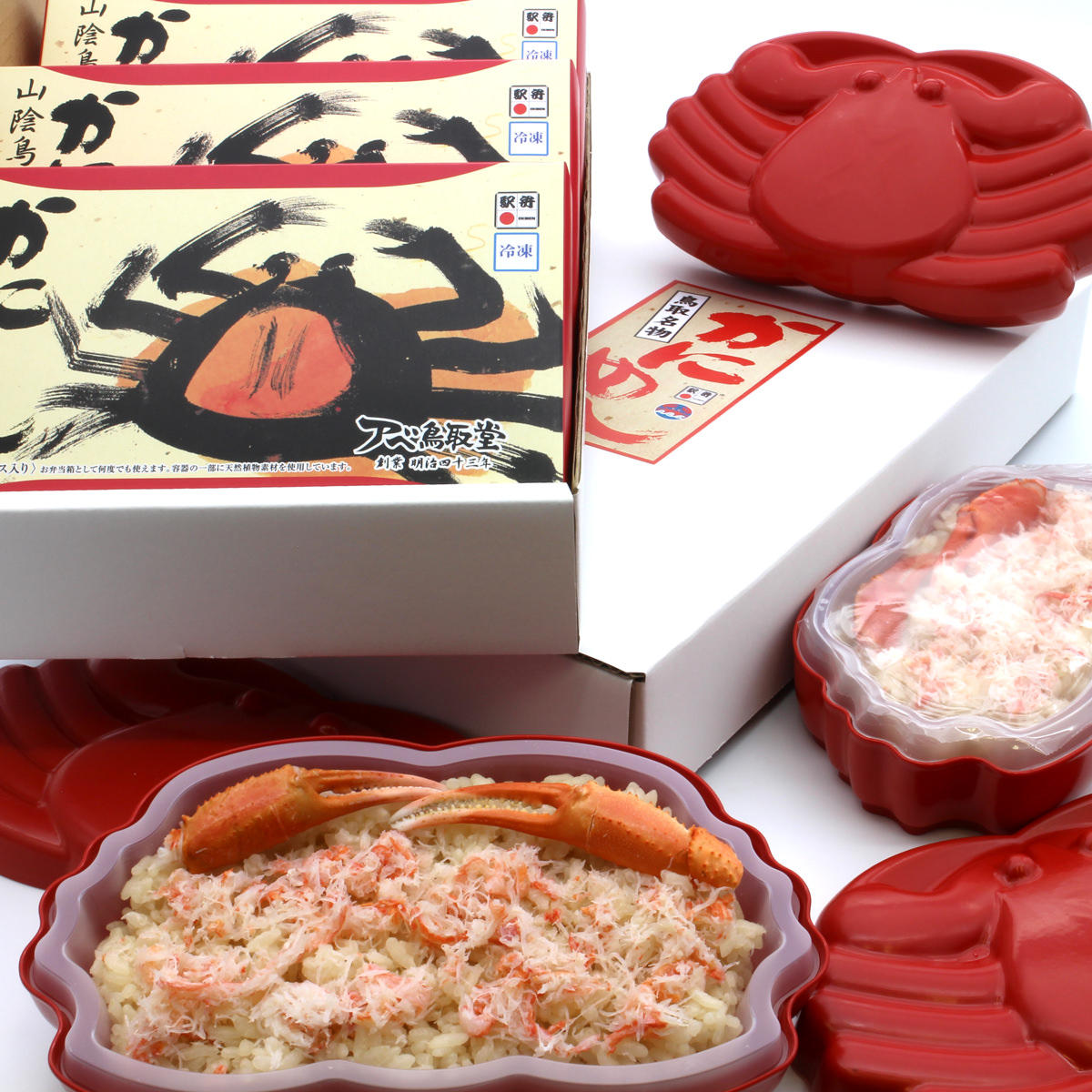 「山陰 鳥取かにめし」は、“かに”をまるごと味わえる風味豊かな鳥取の駅弁です。かに身・かに味噌を入れ炊き上げたご飯に、しっとりとした紅ズワイのホグシ身を盛りつけ、瞬間冷凍致しました。見た目にも可愛いかに型容器は、植物由来原料が10%練り込んである自然に優しい材質です。