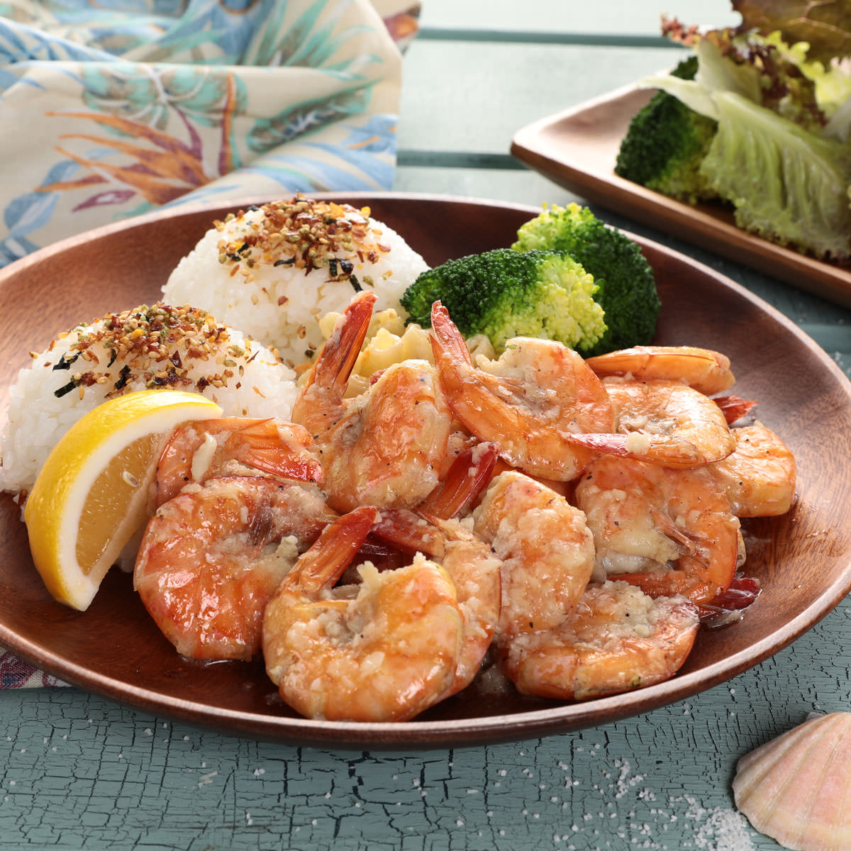【ケイジャンガーリックシュリンプ】殻付きシュリンプをガーリックや香味野菜、レモン、白ワイン、オリーブオイルなどでマリネし、ケイジャンスパイスでスパイシーにソテーした一品。