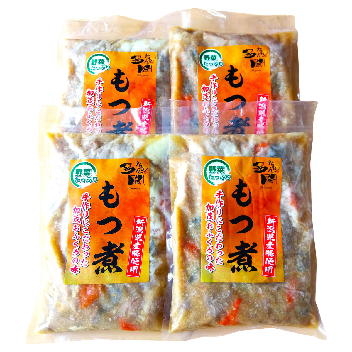 「もつ煮」は、新潟県加茂市、地元の常連さんで賑わう居酒屋「多聞(たもん)」の人気メニューを真空パックにしたものです。新潟県産の豚を使用し、自社厨房にて手づくりしたともつ煮をお届けします。味付けは「おふくろの味」がコンセプトの味噌味です。にんじん、大根などの野菜と一緒に、じっくりと時間をかけて煮込みました。もつと野菜の旨みたっぷり、濃厚な味わいに仕上げています。野菜が入っているので、面倒な調理は不要です。電子レンジや鍋、湯煎で温めるだけで、すぐに食卓へ出すことができます。夕食のおかずに、お酒のおつまみに、美味しいもつ煮をお楽しみください。新潟県加茂市にて、販売を開始したところ、地域の方に大人気となり「加茂オリジナル推奨品」に認定されました。