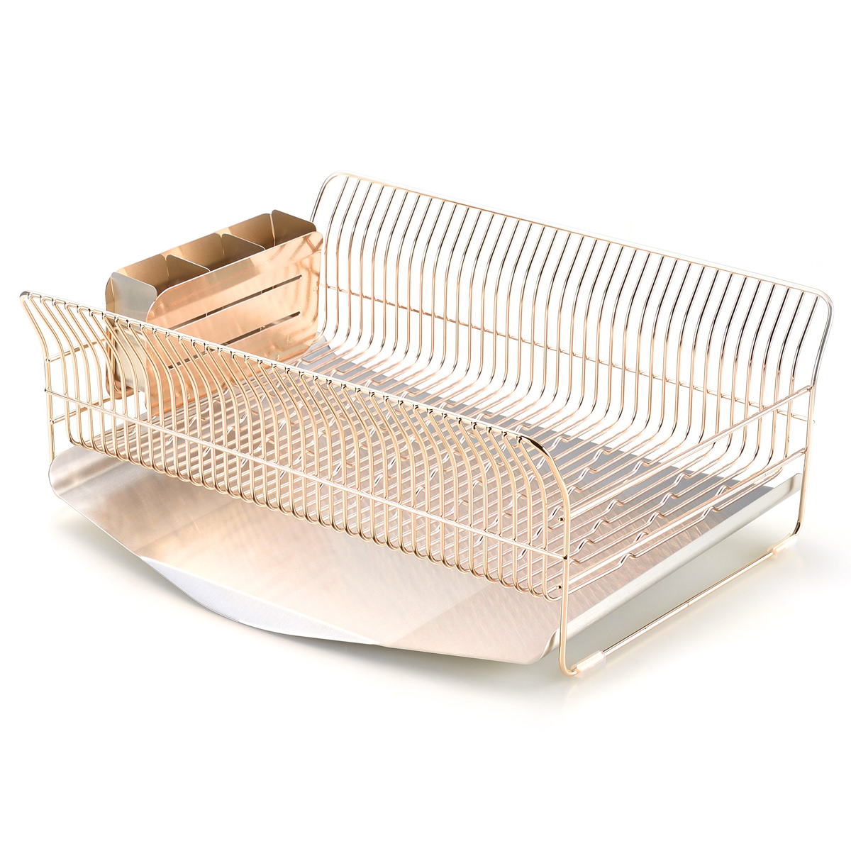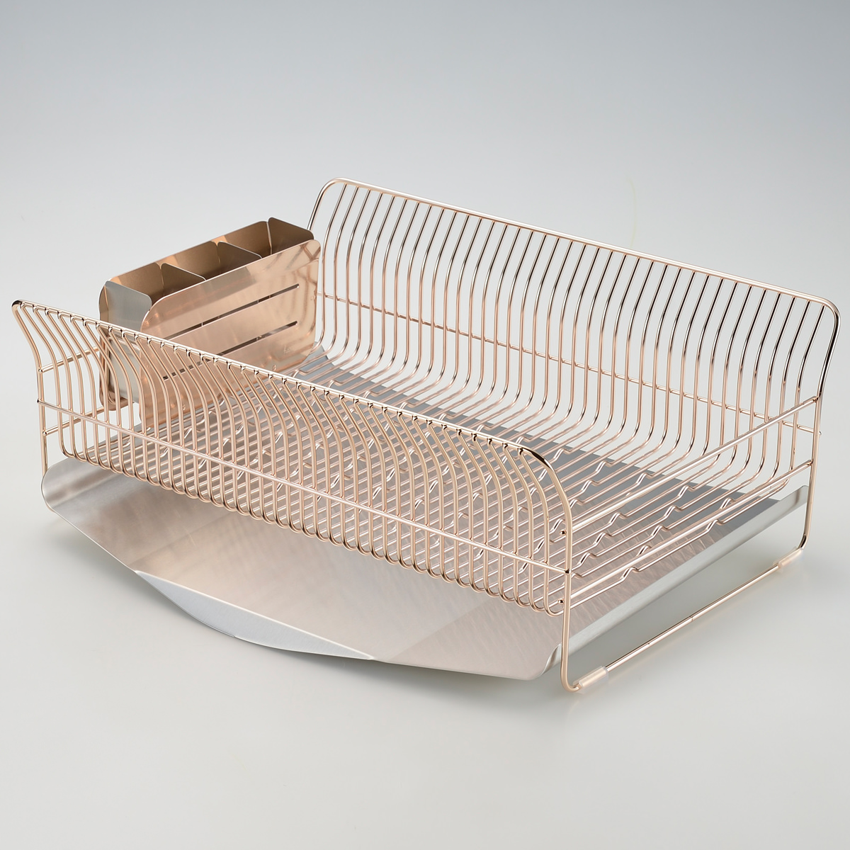 食器の向きを気にせず置ける「水切りラック 縦置きタイプ ローズゴールド」です。底面に凹凸をつけた波型ワイヤーの『たてよこウェーブ[PAT.P]』が置いた食器をキャッチします。美しいカーブがしっかりお皿を受け止めるので、縦でも縦でも食器の向きを気にせず、無造作に置けます。