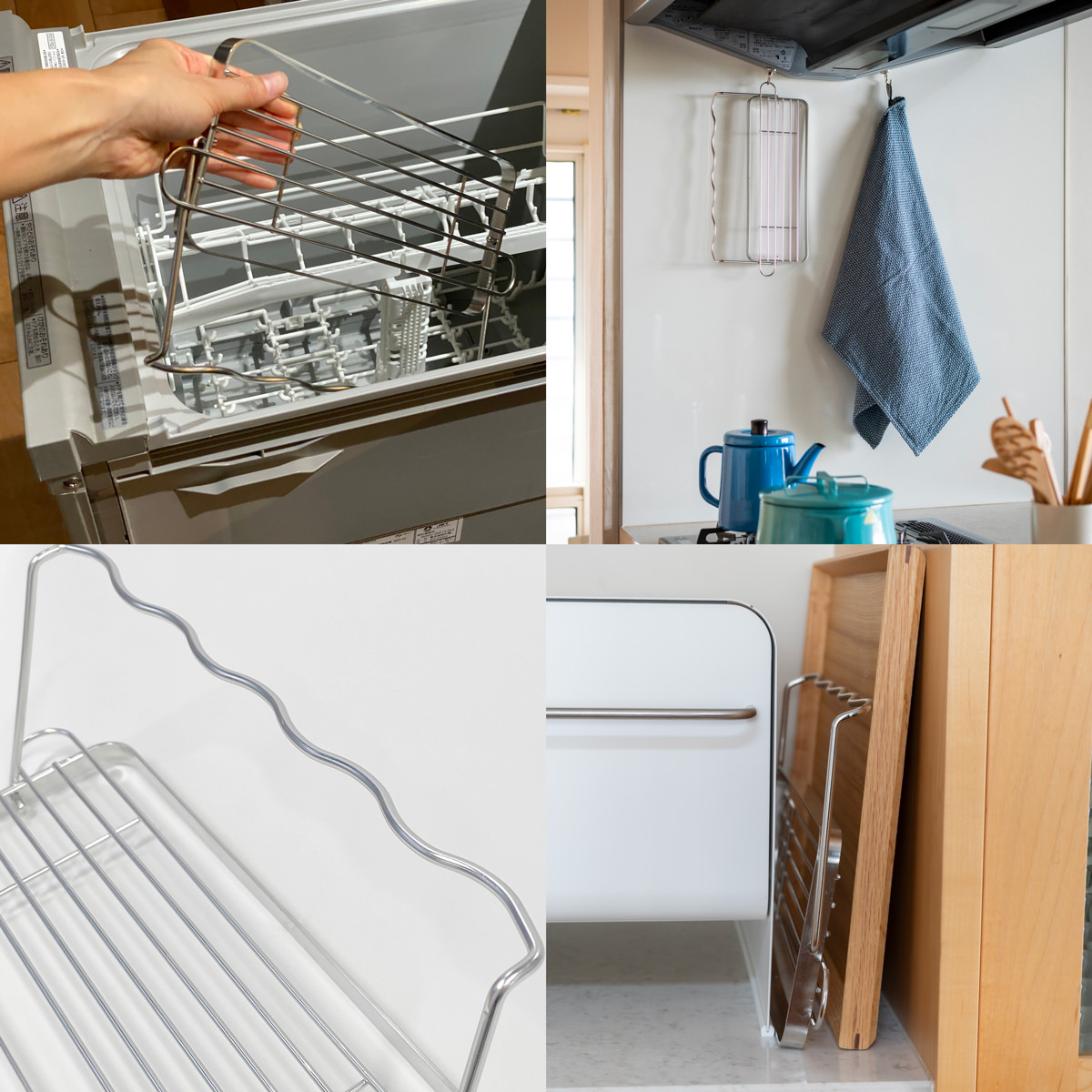 折り畳むと高さ2.3cmほどになる薄型設計です。引っ掛け収納も可能なので、収納スペースに困りません。燕三条製の丈夫でサビに強い18-8ステンレスのスタンドです。食器洗浄機に対応しており、お手入れも簡単です。