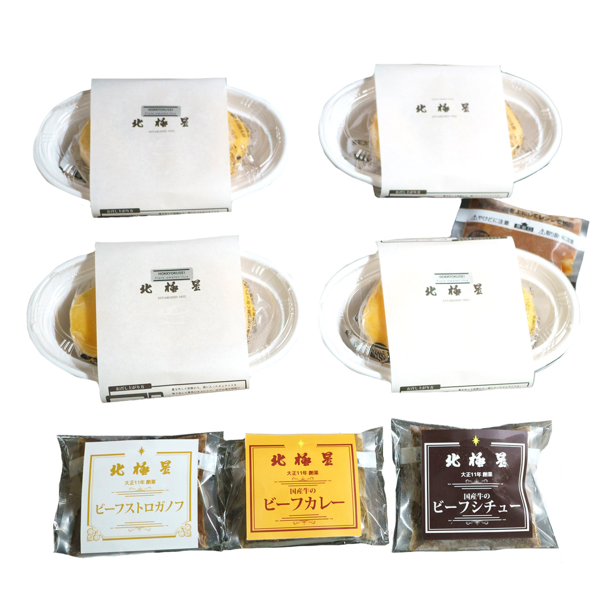 ●数量・内容:特製チキンオムライス250g×1、特製オムライスソース70g×1、バターオムライス250g×3、ビーフストロガノフ150g×1、国産牛のビーフカレー150g×1、国産牛のビーフシチュー170g×1
