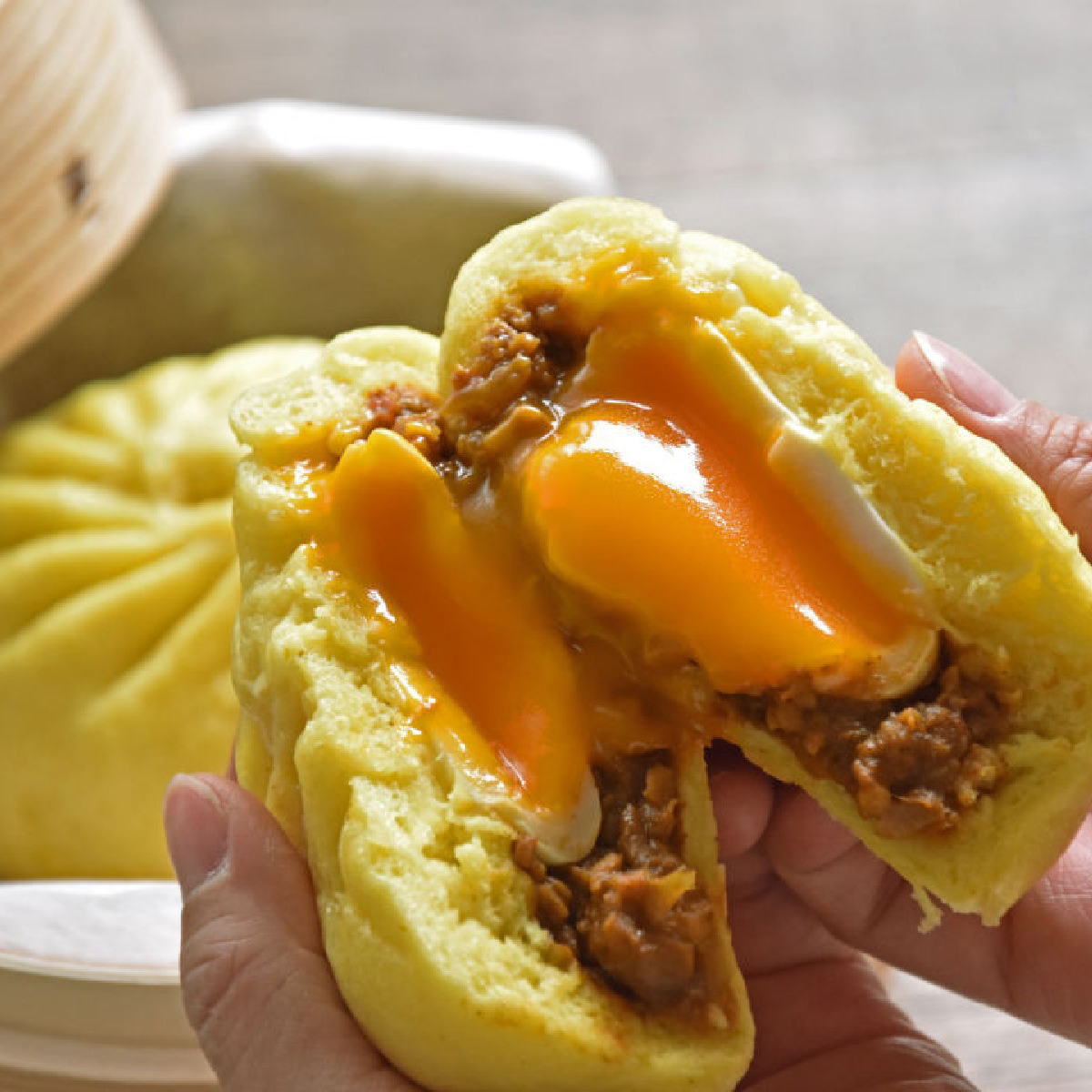 「名古屋肉まん本舗 招福コーチンカレーまん」は、名古屋コーチンの肉をたっぷり使用した中華まんです。コクのあるスパイシーなカレーの中から、とろ~りとした半熟の玉子があふれ出てきます。名古屋コーチンのうまみを生かすために、丸鶏のスープを使用しています。ミンチ状のコーチン肉のほど良い歯ごたえをお楽しみください。愛知県産きぬあかり(小麦粉)を使用したもっちり食感の生地にもカレー粉が練り込まれています。