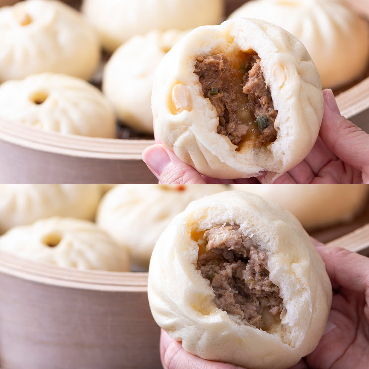 <招福肉まん>愛知県の伝統野菜「野崎白菜」をたくさん使用した味わい豊かで食べやすい豚まん。白菜の甘みと知多三元豚のうまみが絶妙にマッチした肉餡です。