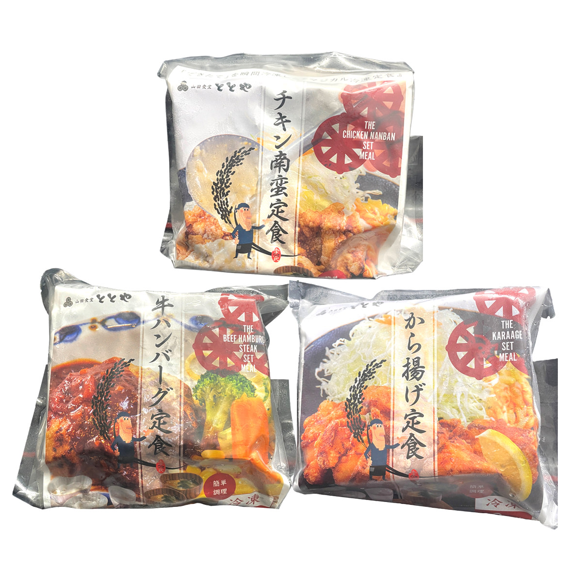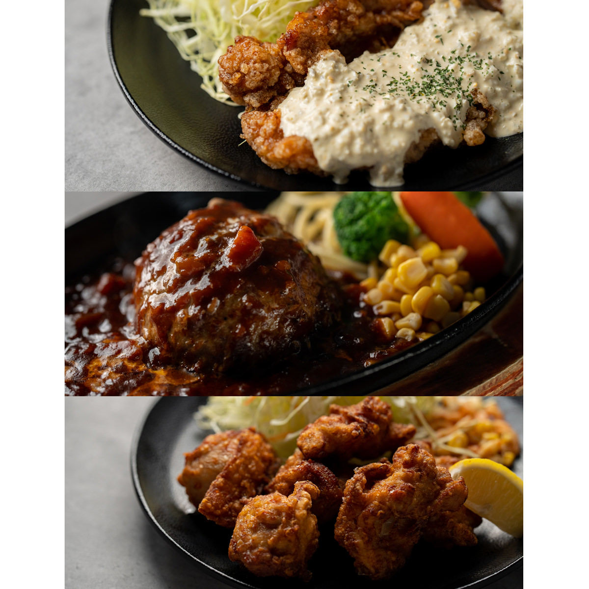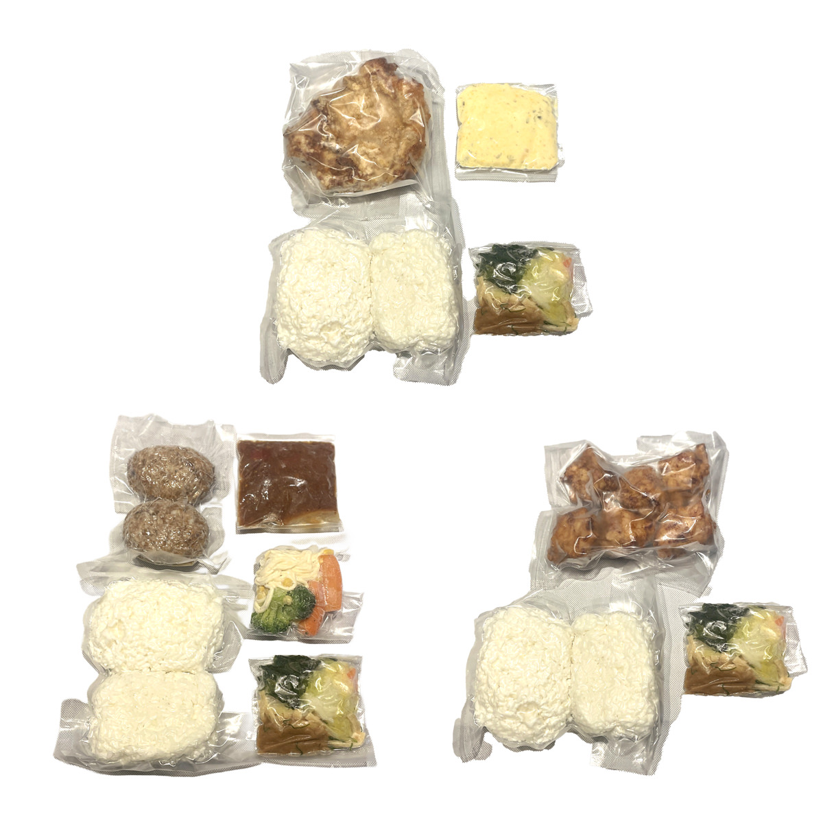 ●数量・内容:チキン南蛮定食(ご飯150g×2、チキン南蛮250g×1、タルタルソース80g×1、みそ汁キット70g×1)、牛ハンバーグ定食(ご飯150g×2、ハンバーグ80g×2、付け合わせ90g×1、デミグラスソース80g×1、みそ汁キット70g×1)、から揚げ定食(ご飯150g×2、から揚げ230g×1、みそ汁キット70g×1)