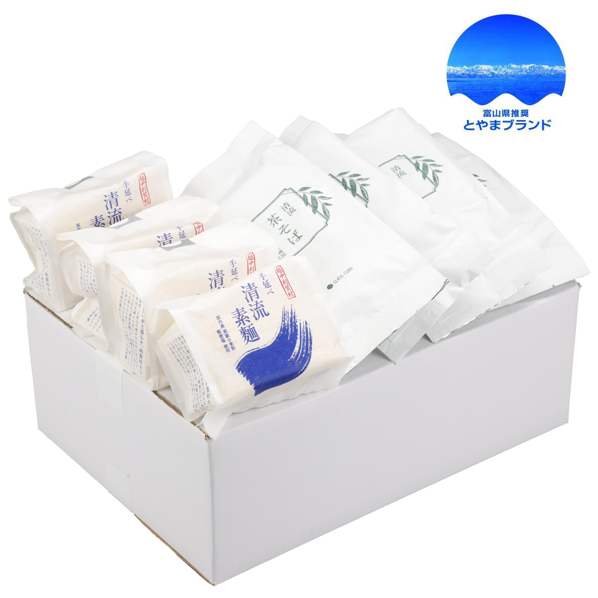 「国産小麦 能登塩使用 手延べ清流素麺 清流茶そば」は、厳選した国産小麦と能登塩を使用した手延べ素麺と、しっかりとしたコシの強さを楽しめる茶そばのセットです。秀でた魅力を持つ富山の県産品の中から特に優れた品を厳選し、基準を満たしたものを県知事が認定する「富山県推奨とやまブランド」に認定されました(2024年)。