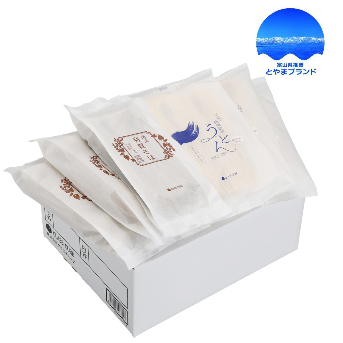 「国産小麦 能登塩使用 手延べ極細清流うどん 清流利賀そば」は、厳選した国産小麦と能登塩を使用した手延べうどんと、しっかりとしたコシの強さを楽しめるそばのセットです。秀でた魅力を持つ富山の県産品の中から特に優れた品を厳選し、基準を満たしたものを県知事が認定する「富山県推奨とやまブランド」に認定されました(2024年)。