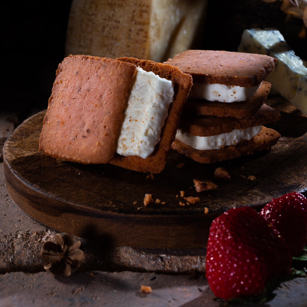 <チーズサンドあまおう>2種の熟成チーズ、風味豊かなあまおうピューレをクッキー生地に練りこんで焼き上げた、上品な味わいのサンドクッキー。