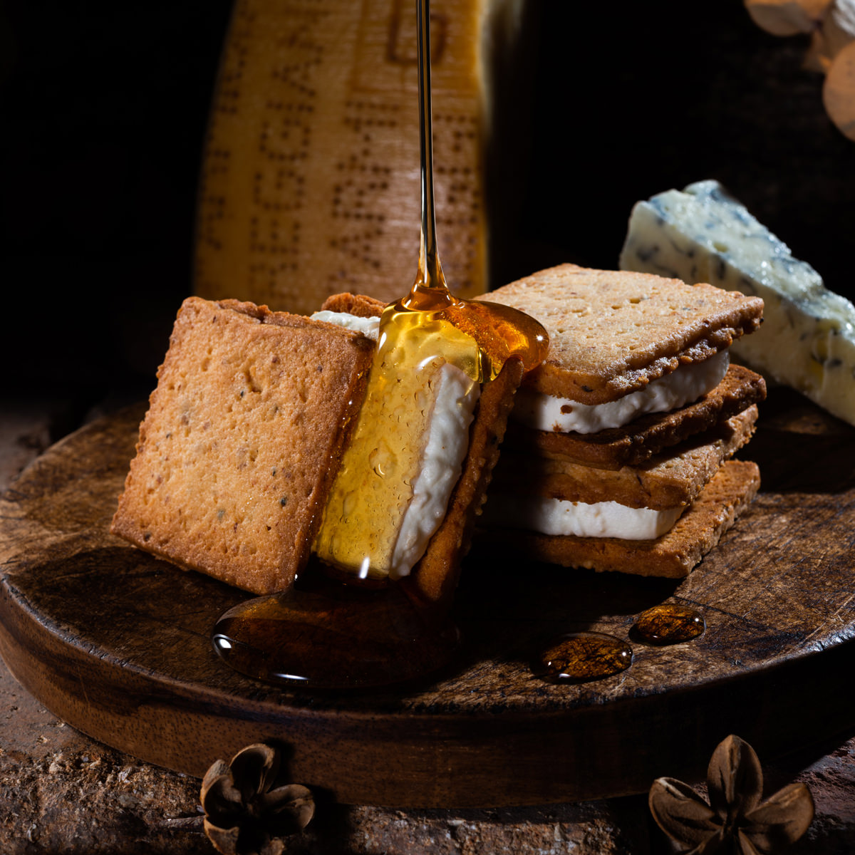 <チーズサンド福津ハニー>2種類の熟成チーズ、福岡県福津市産のはちみつ・米粉をクッキー生地に練り込んで焼き上げました。ライスパフ練り込んだクリームチーズを使用。