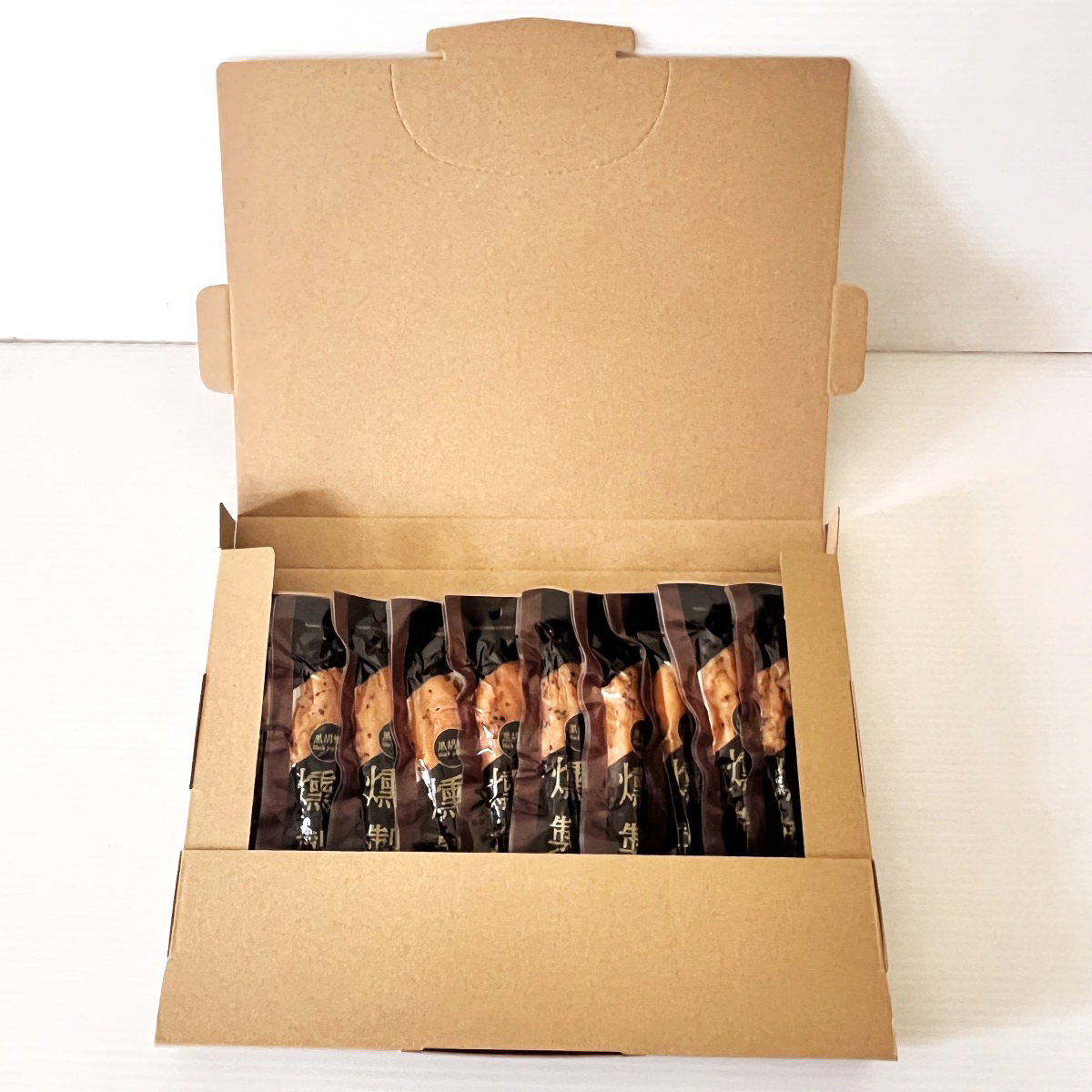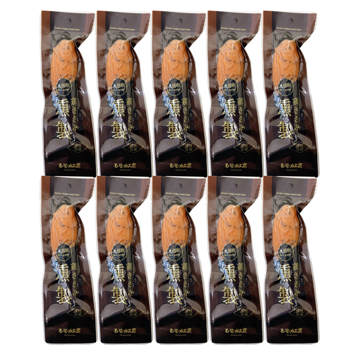 宮崎県産鶏ささみを独自に味付けした後、じっくり丹念に燻製した「宮崎産 鶏ささみ 燻製 黒胡椒」です。黒胡椒が効いたスパイシーな味わいになっています。ビール、日本酒、焼酎、ワインなどとの相性が良く、お酒のおともとして、美味しい大人のおつまみをお楽しみいただけます。常温保存が可能なため、日常のストック、常備品、非常食などにもご利用ください。