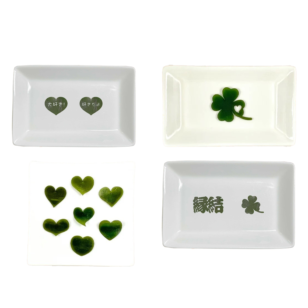 ●数量・内容:ハートこんぶ(7種入)、ハートde好きだよ(ハート×4、クローバー×1)、ハートde大好き!(ハート×4、クローバー×1)、縁結昆布(5個入)、四つ葉のクローバー昆布(7個入)