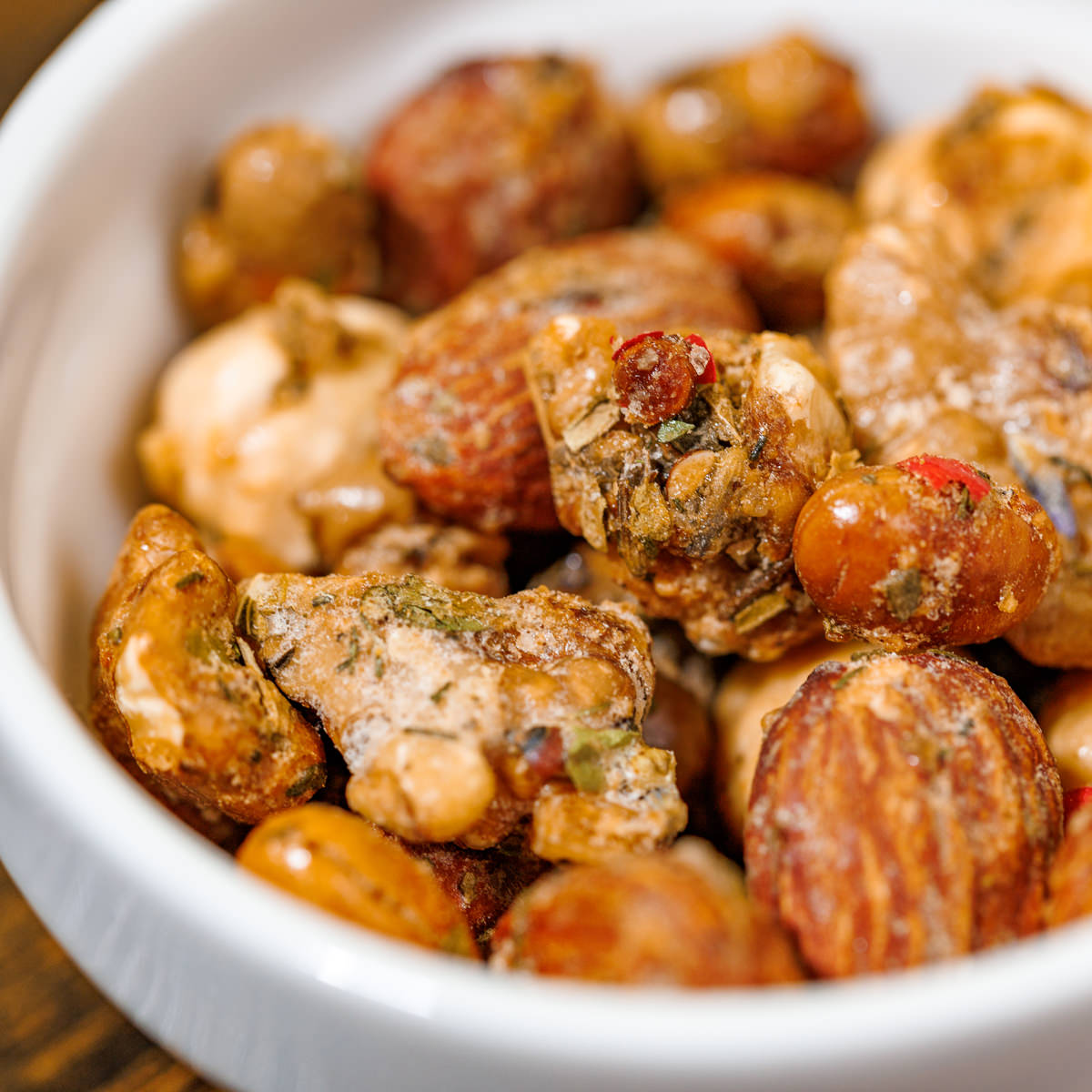 ●原材料:アーモンド(アメリカ産)、くるみ、大豆(北海道産)、へーゼルナッツ、鶏卵、甜菜糖(北海道製造)、食塩、混合スパイス(地中海ハーブスパイスミックス(内製))、ピンクペッパー、ガーリック、黒胡椒、ラベンダー