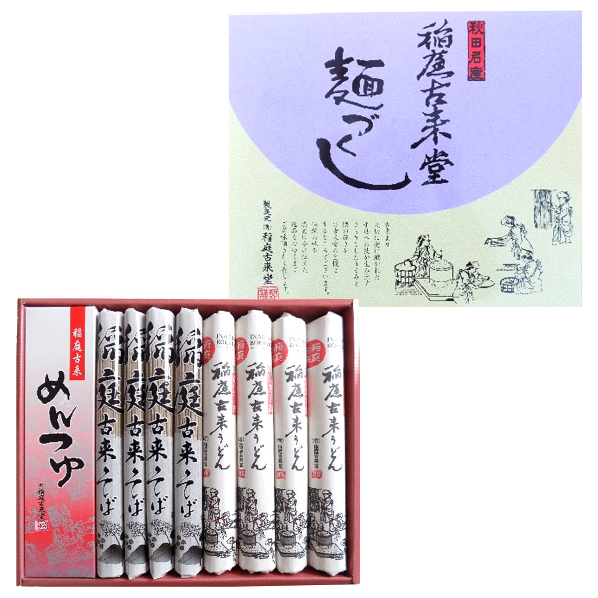 「稲庭古来うどん そば つゆ付 食べ比べ」は、稲庭古来うどん、稲庭古来そば、稲庭古来つゆの詰め合わせです。秋田県稲庭地区に江戸時代から継承されている伝統製法を用いて熟練の職人が1本1本丁寧に仕上げる『稲庭古来うどん』と、秘伝製法を蕎麦作りに活かした”稲庭の郷”でも珍しい滋味豊かな味わいの『稲庭古来そば』の2種の麺と、特製の『稲庭古来つゆ』をセットにしました。化粧箱に入れてお届けしますので、贈答用にもぴったりです。