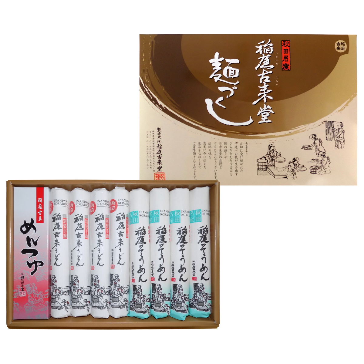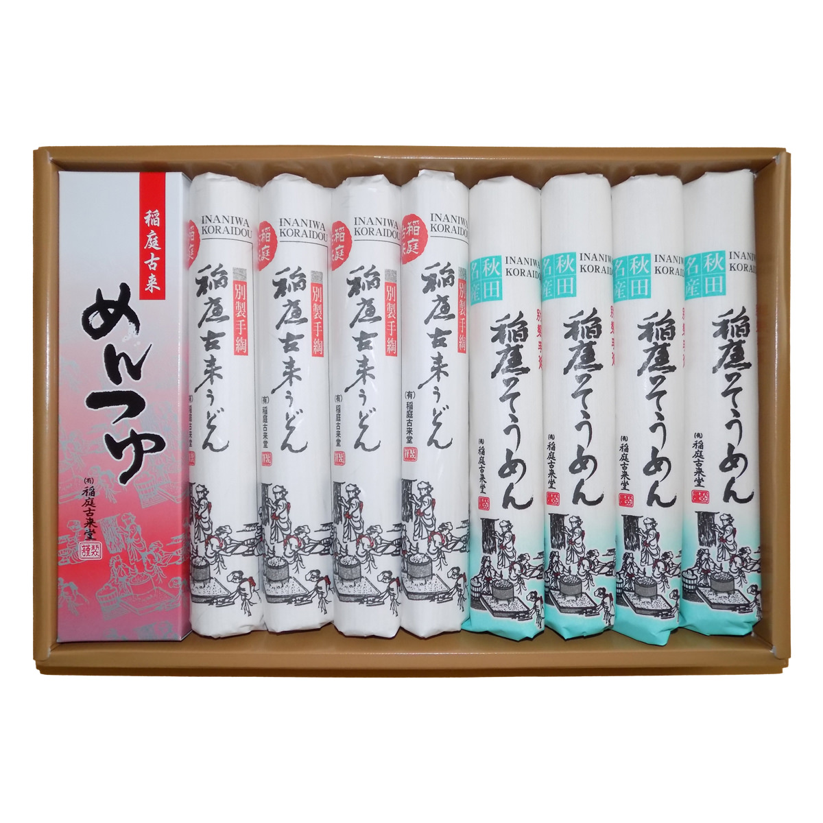 「稲庭古来うどん そうめん つゆ付 食べ比べ」は、稲庭古来うどん、稲庭古来そうめん、稲庭古来つゆの詰め合わせです。秋田県稲庭地区に江戸時代から継承されている伝統製法を用いて熟練の職人が1本1本丁寧に仕上げる『稲庭古来うどん』と、油を使わずに仕上げた極細の『稲庭古来そうめん』の2種の麺と、特製の『稲庭古来つゆ』をセットにしました。化粧箱に入れてお届けしますので、贈答用にもぴったりです。