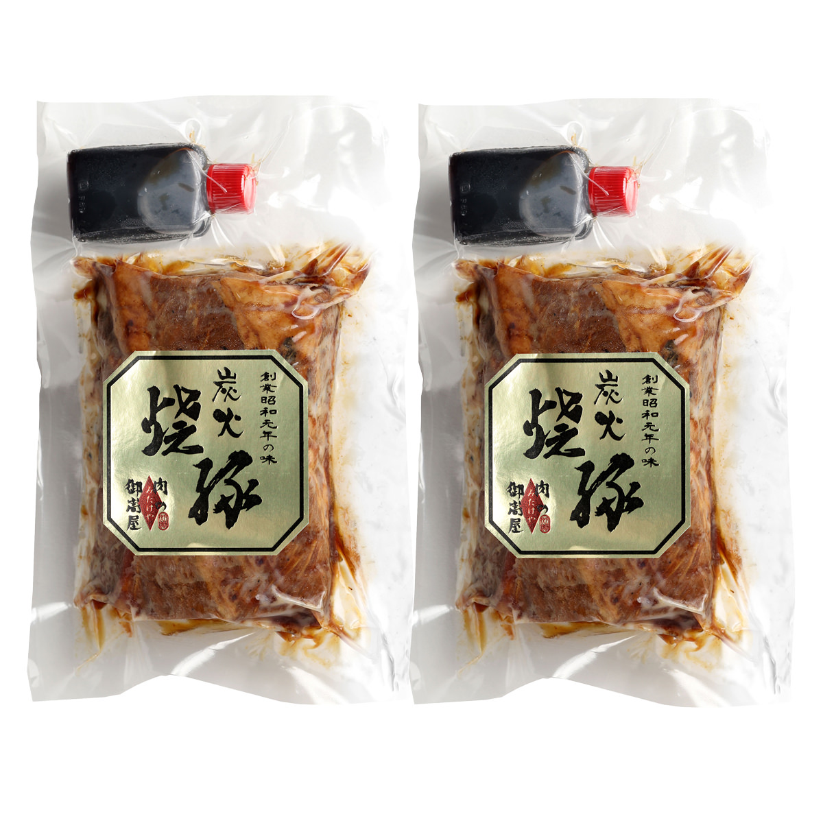 昭和元年(1926年)創業、岐阜県八百津町(やおつちょう)の老舗精肉店がお届けする「御嵩屋 炭火焼豚 2本入 ギフトセット」です。原料は薬味に至るまで国産を使用。冷凍品は一切使わず、生のもののみを使用しています。地元の醸造元ヤマコノ様に焼豚用に作っていただいた醤油をベースに継ぎ足しで作ったタレでじっくり煮込んでいます。本品は二代目女将山田知子が調理師免許を取得し、完成させた御嵩屋(みたけや)オリジナルの焼豚です。その焼豚にさらに付加価値を付けようと、三代目社長山田眞二が樫、ブナ、桜といった香の良い木炭で表面を焼き上げて香り付けをすることを考案し、現在の御嵩屋看板商品である「炭火焼豚」となりました。お召し上がりの際は袋から出し、お好みの厚さに切ってから皿に盛り、ラップを軽くかけて電子レンジ(500W)で温めてください(2~5分くらいが目安)。タレは別皿に出して後付けがおすすめです。