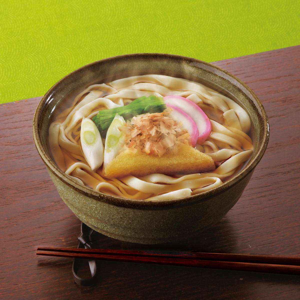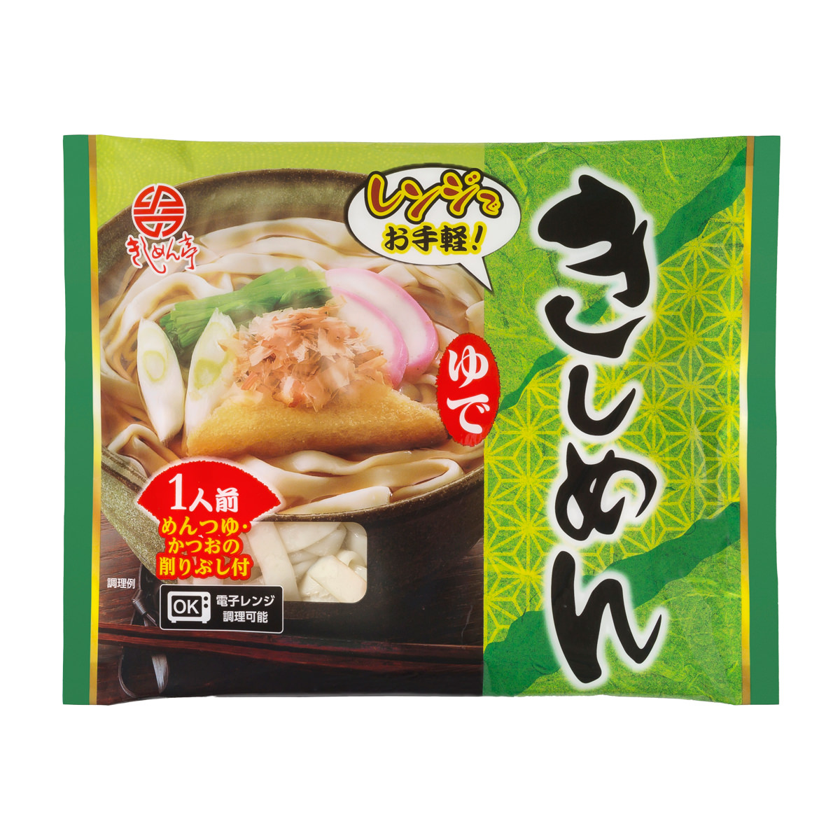 ソフトな弾力の平打ちめん、めんつゆとかつおの削りぶしをセットにした「レンジ対応 名古屋 ゆで きしめん」です。麺は電子レンジで温められるので、お手軽かつ簡単に調理できます。