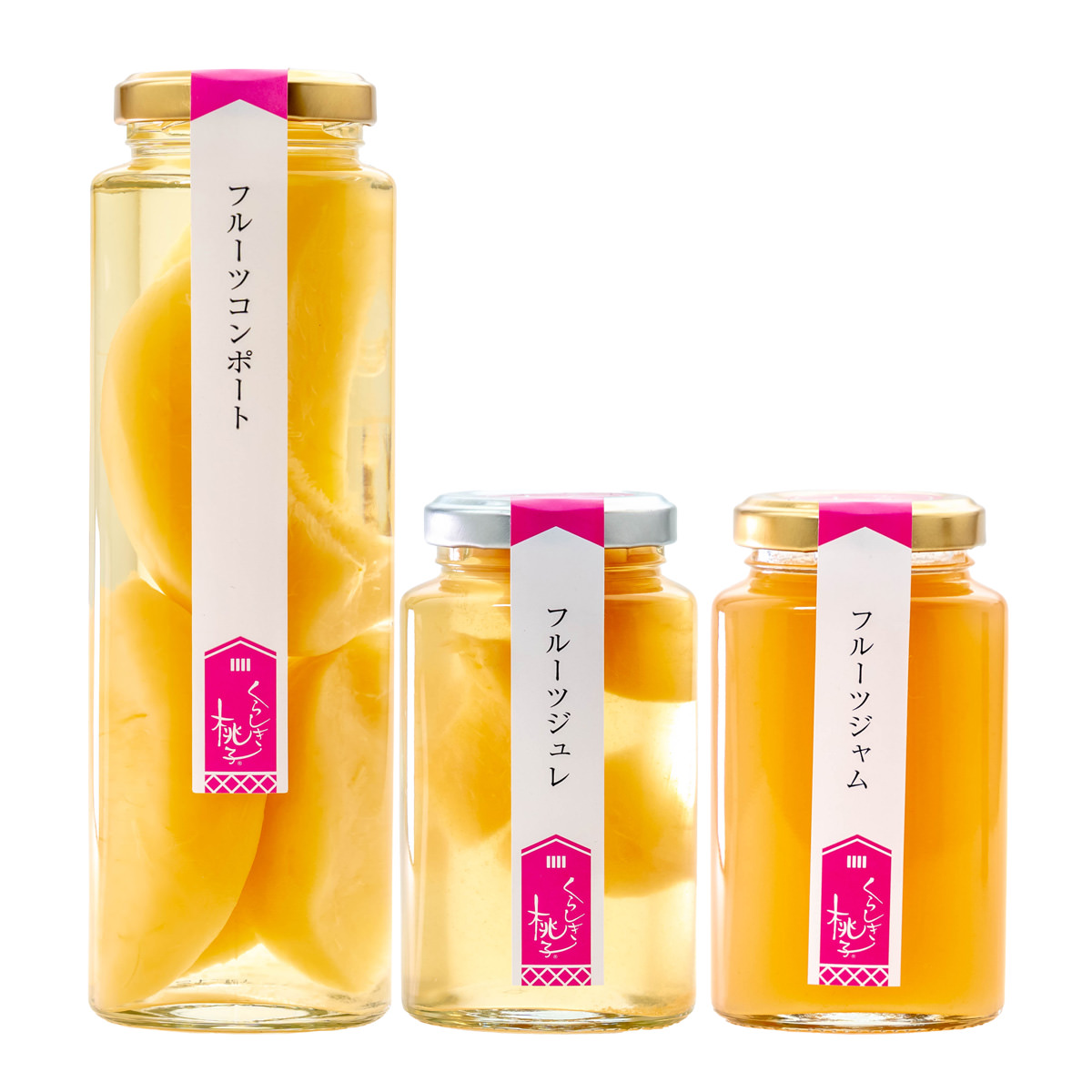 くらしき桃子の「清水白桃づくし コンポート ジュレ ジャム 3種 詰め合わせ」は、岡山県産清水白桃のコンポート(シロップ漬け)、フルーツジュレ、低糖度のフルーツジャムの3種類のセットです。岡山産の桃、清水白桃(しみずはくとう)を旬の時期に収穫してスイーツに仕上げ、美味しさをギュッと閉じ込めました。おやつ、デザート、パンのおとも、ヨーグルトやアイスクリームのトッピングなどとしてお召し上がりください。限られた時期にしか味わえない美味しさをいつでもお好きな時に愉しめる、ギフトにもおすすめのアソートです。桃好きの方にもどうぞ。
