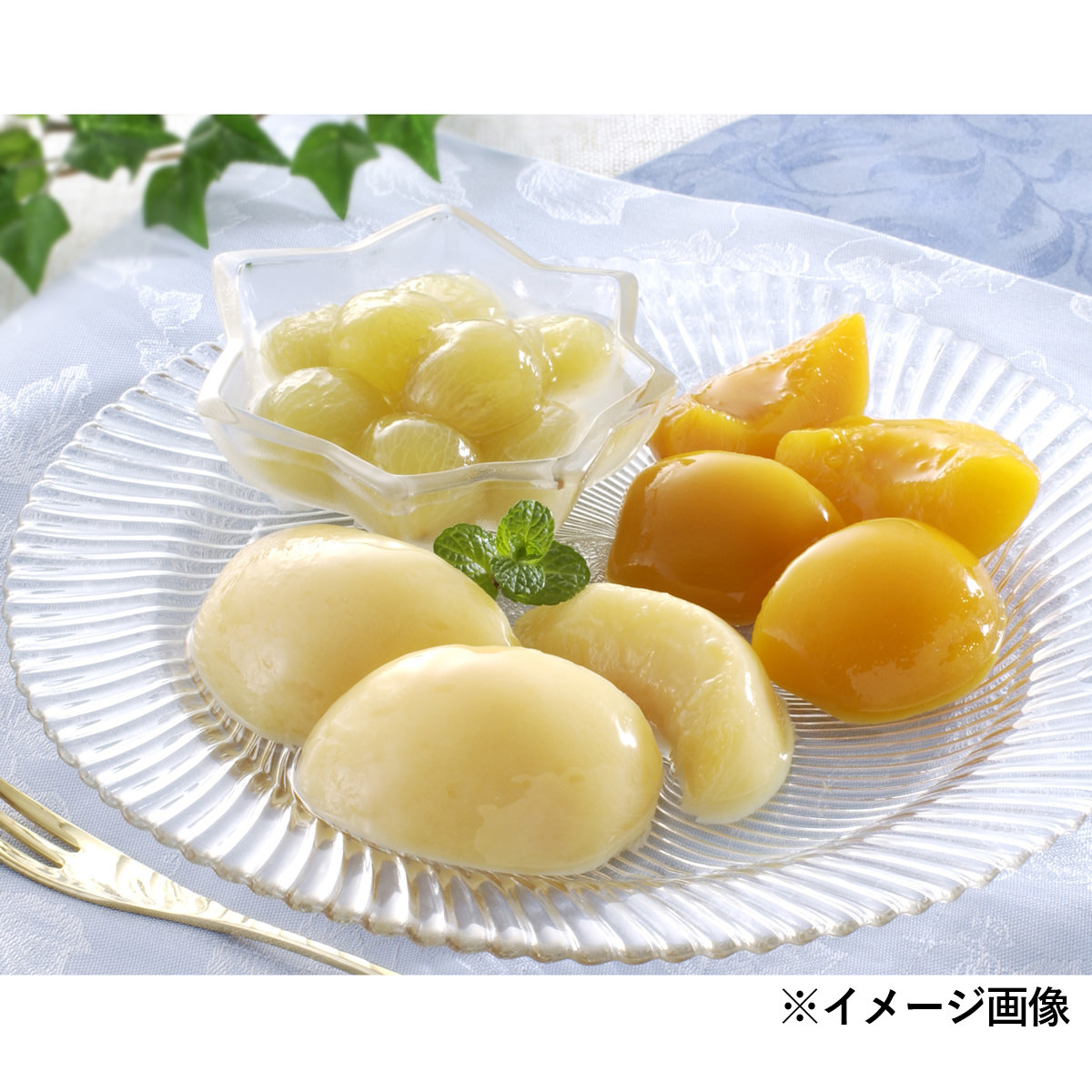 <フルーツジュレ>白ももシロップ漬け(もも(清水白桃)(岡山県産)、砂糖)、砂糖、りんご果汁、洋酒/ソルビット、ゲル化剤(増粘多糖類)、酸味料、香料