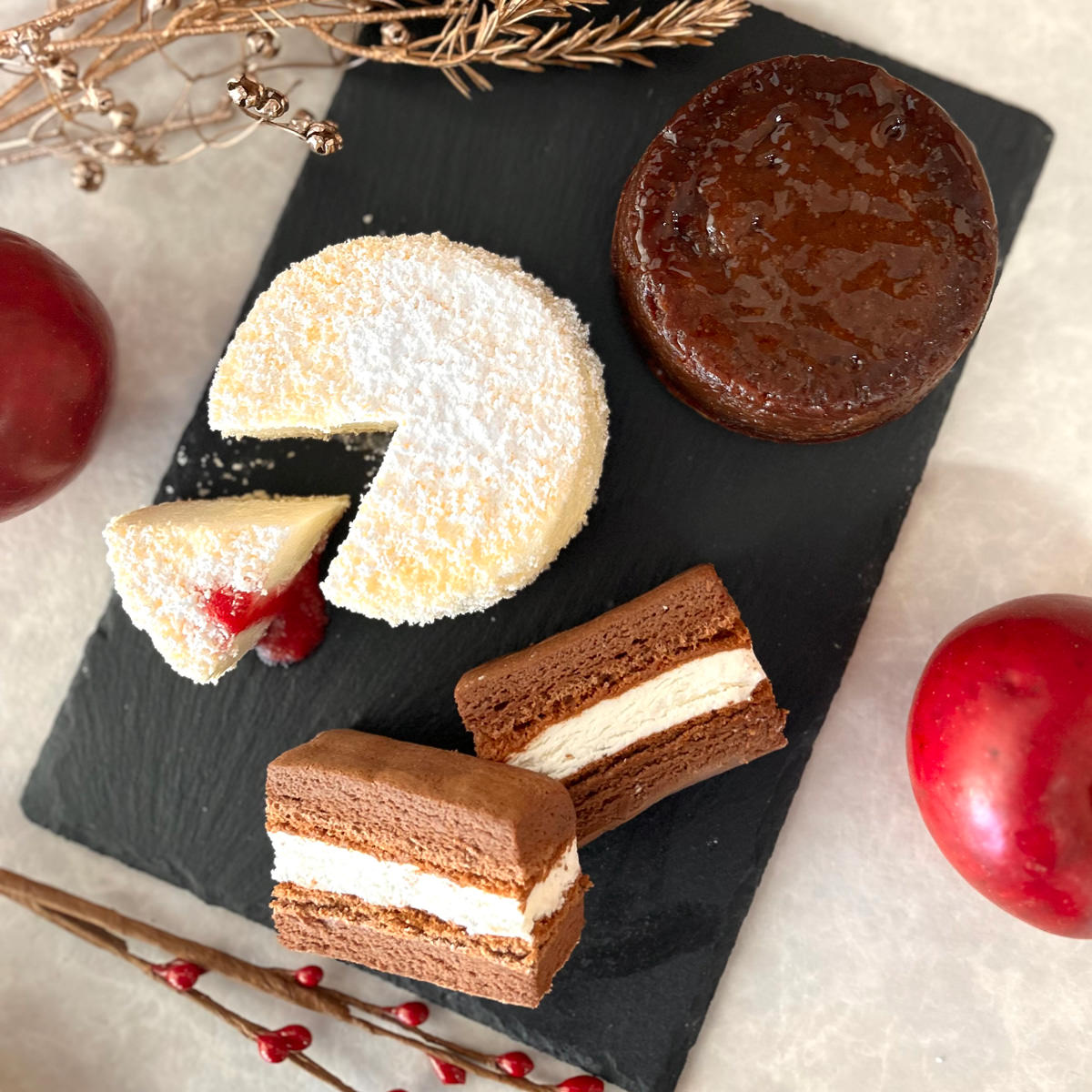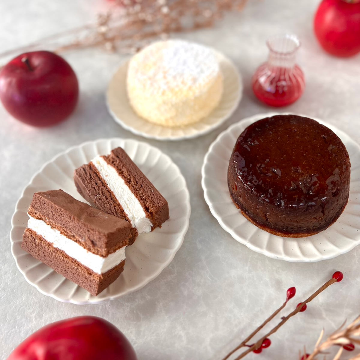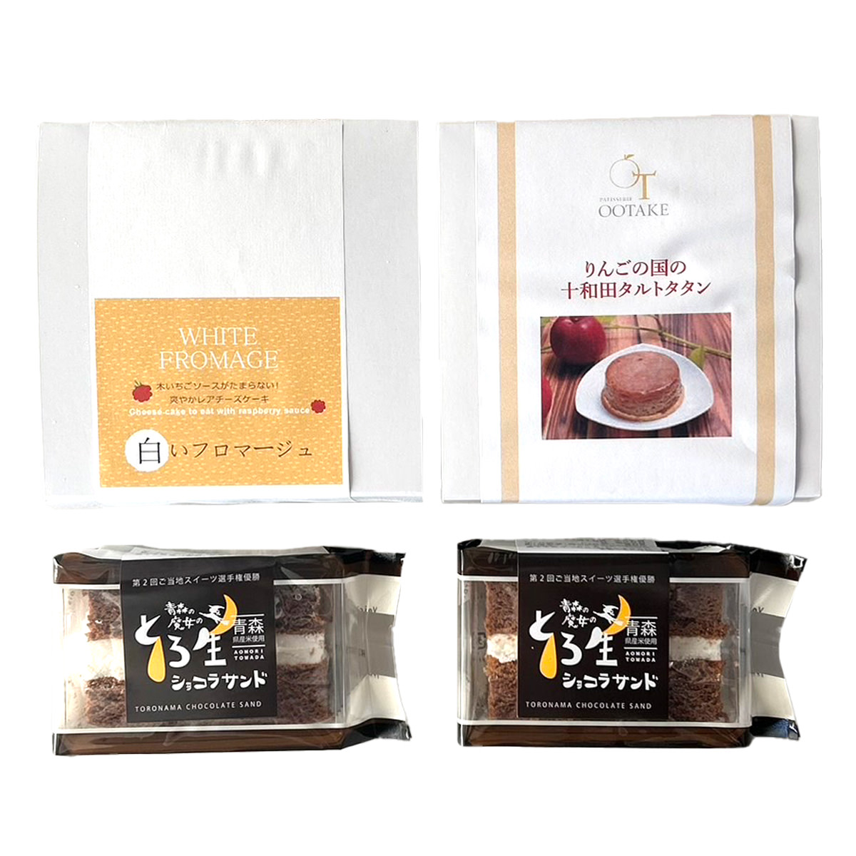 ●数量・内容:りんごの国の十和田タルトタタン約310g×1、白いフロマージュ(ケーキ約220g、木苺ソース50g)×1、青森の魔女のとろ生ショコラサンド50g×2