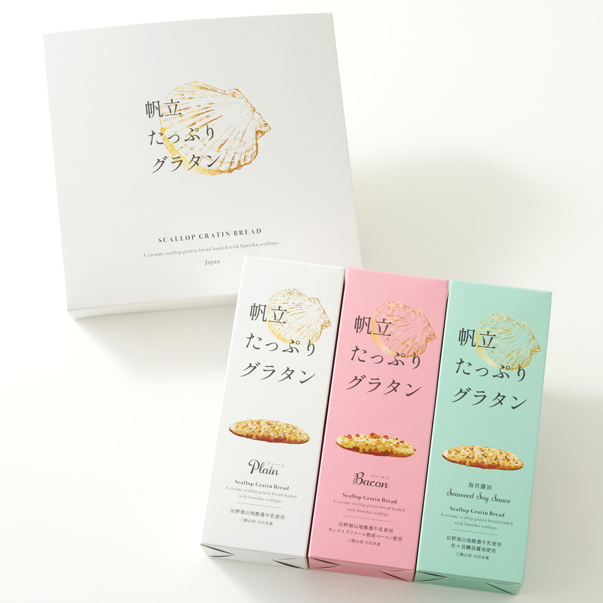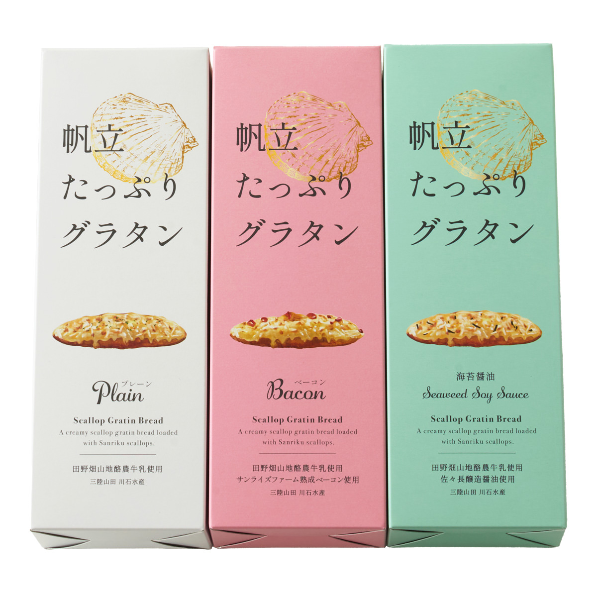 「三陸 帆立たっぷりグラタン 惣菜パン 3種」は、三陸産のホタテ貝柱のほぐし身と岩手県田野畑村の山地酪農牛乳を贅沢に使ったパングラタンです。ホタテが主役の『プレーン』、7日間熟成し桜チップで燻製した『ベーコン』、三陸産の海苔と岩手県東和町の醤油で和風にアレンジした『海苔醤油』3種のセットです。朝食、ランチ、軽食、食卓の一品など、さまざまなシーンでご利用いただけます。