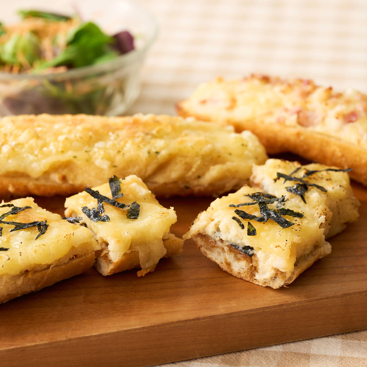 <海苔醤油>パン(岩手県製造(小麦粉、食塩、イースト))、ホワイトソース(国内製造(小麦粉、植物油脂調製品、その他))、ホタテ、チーズ、もち、バター、牛乳、生クリーム、海苔、醤油、砂糖、マスタード、ブイヨン、食塩、ホワイトペッパー/調味料(アミノ酸等)、増粘剤(加工デンプン)、乳化剤(ソルビタン脂肪酸)、V.C、(一部に乳成分・小麦・鶏肉・牛肉・大豆を含む)