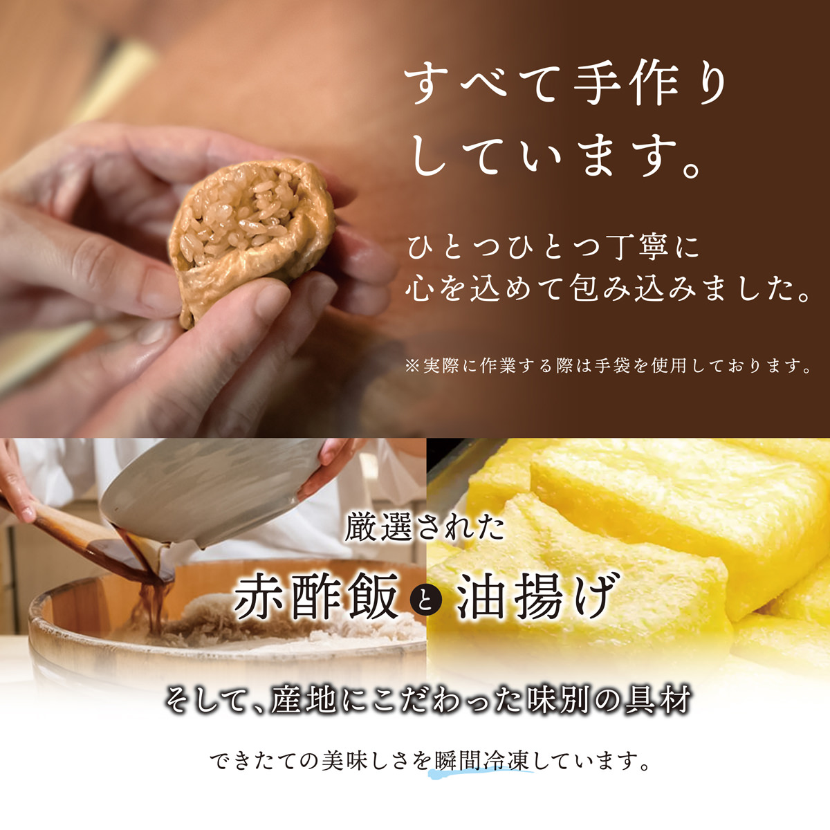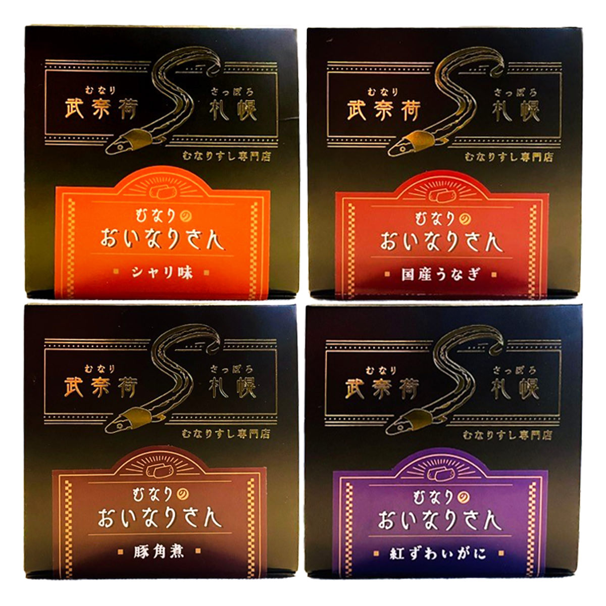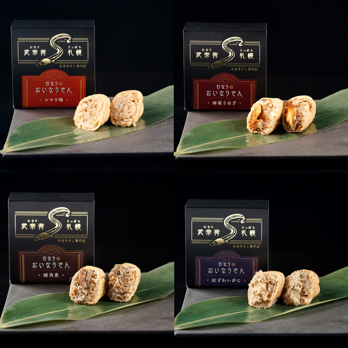 北海道札幌市のむなりすし専門店「武奈荷 札幌(むなりさっぽろ)」がお届する「むなり寿司 いなり うなぎ 蟹 シャリ 角煮」です。指定農家直送の北海道産米をコクのある赤酢と合せたシャリ。老舗豆腐店のお揚げをどんこ出汁でふっくら炊き上げ、国産、北海道産の食材を寿司職人ならではの技で調理、全てのこだわりを包み隠した稲荷寿司です。一つ一つ丁寧に心を込めて手作りで包み込んだ稲荷寿司を、アルコール凍結機で急速冷凍しましたので、出来立ての味そのままご自宅でお楽しみいただけます。国産うなぎ、紅ずわいがに、シャリ味、豚角煮の4種を詰め合わせました。それぞれ異なる味わいを食べ比べてお楽しみください。解凍後、電子レンジで加熱するだけの簡単調理でお召し上がりいただけます。