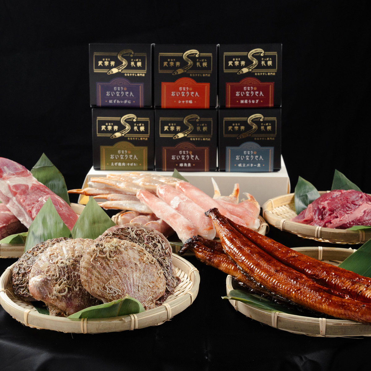 ●数量・内容:国産うなぎ、紅ずわいがに、帆立バター煮、シャリ味、豚角煮、えぞ鹿肉(そぼろ) 各50g×2