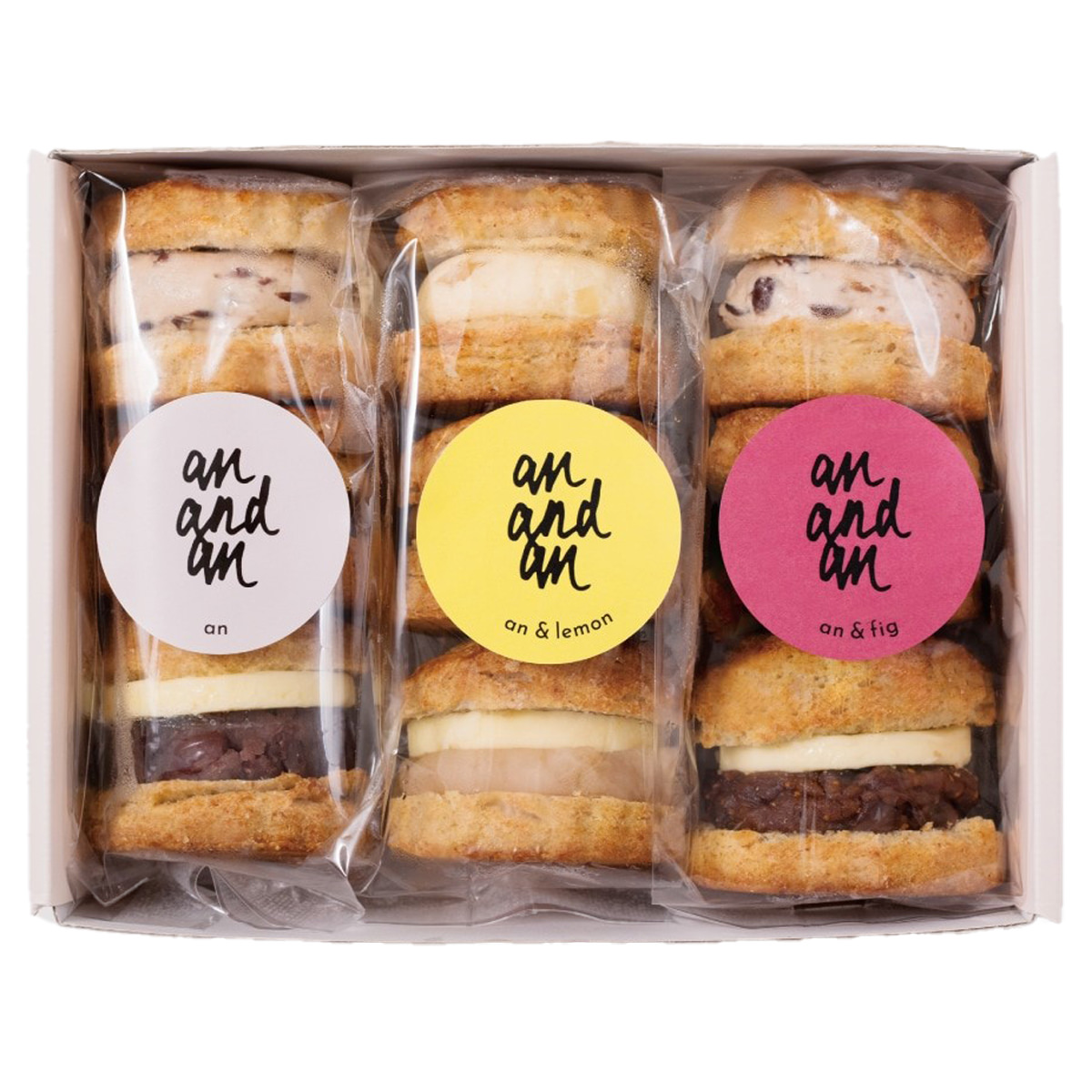 和歌山県のスナックQuattro(クワトロ)から誕生したスナック専門店”an and an(アン アンド アン)”がお届けする「あんバター スコーンサンド ギフトBOX」です。全粒粉と天然塩を使用したスコーンにあんを挟みました。