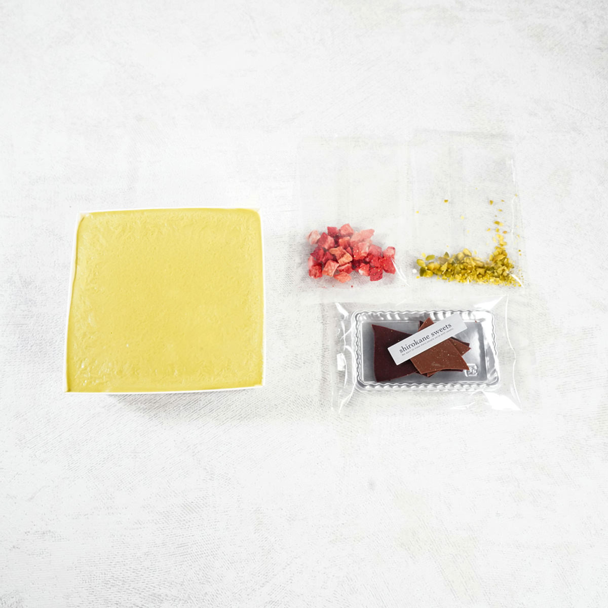<飾り>チョコレート(国内製造)、ピスタチオ、フリーズドライイチゴ/乳化剤、金箔、(一部に乳成分・大豆を含む)