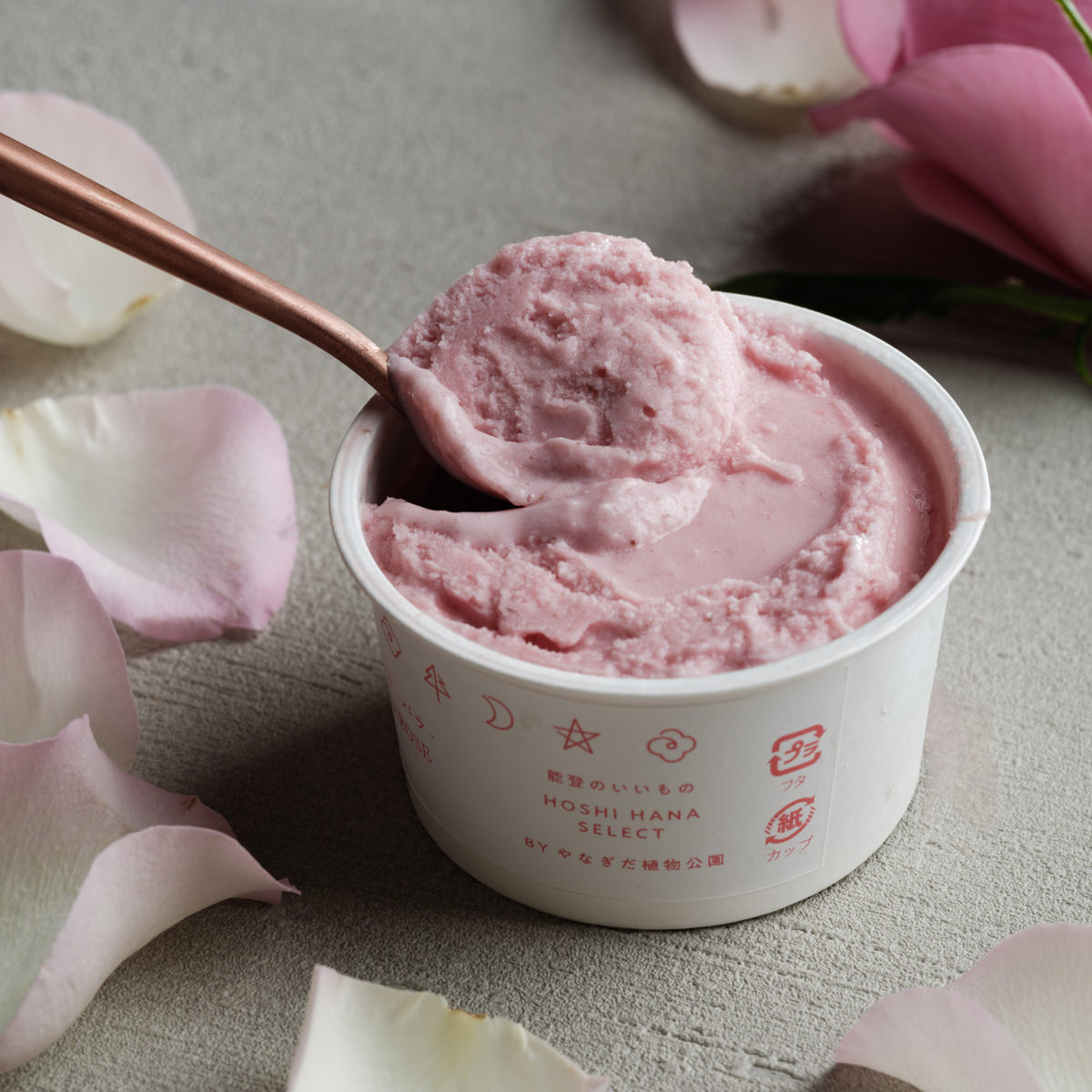 <マスカルポーネローズ>やなぎだ植物公園スタッフおすすめのフレーバー。マスカルポーネチーズのコクとバラの華やかな香りが上品な味わいを演出。