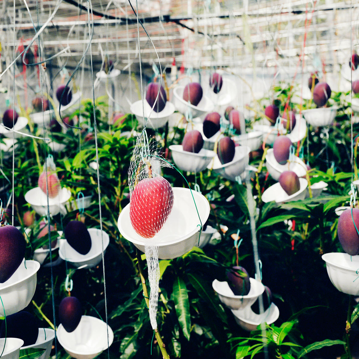 白銀の地”北海道 音更町(おとふけちょう)”で育つマンゴー、糖度11~14.9度の「白銀の太陽」です。長い日照時間やモール温泉、雪などの自然・再生可能エネルギーを活用し、ビニールハウス栽培により生育時期を調整して、冬に出荷しています。湿度が低く寒い季節に実るので、繊維質を感じにくく、えぐ味のないジューシーな味わいをお楽しみいただけます。北海道十勝は湿度が低く、冬は害虫もいないため、栽培期間中農薬不使用です。夏は保存した「雪」を用いて冬と勘違いさせ、冬は「温泉水」を使って温め、全国有数の日照時間に恵まれた十勝の太陽によって希少な真冬のマンゴーを生み出します。収穫時期は、宮崎マンゴーが6~7月なのに対して、11月~12月と真逆です。再生可能エネルギー、十勝の豊かな自然エネルギー、沢山の仲間の力を借りて、多くの奇跡が積み重なって実った、冬に生産される希少なマンゴーをご賞味ください。